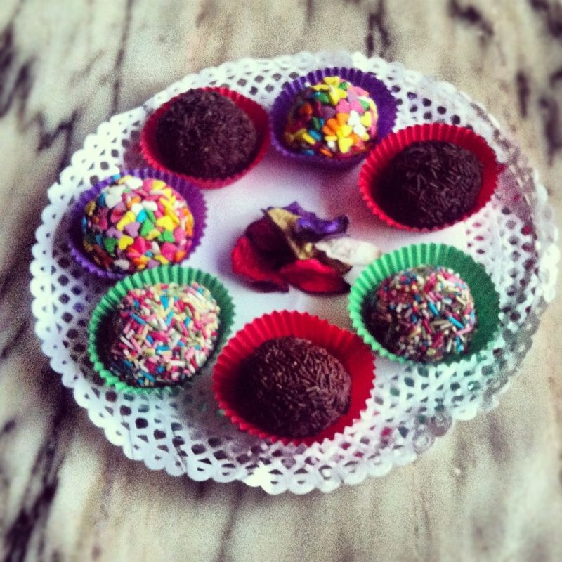 Pon todos los ingredientes en un cazo a fuego medio/bajo removiendo sin (parar para que no os pegue) y esperar a que espese, lo retiráis del fuego y lo colocáis en una fuente para que enfríe, cuando este casi frío lo tapáis con film transparente y lo metéis a la nevera, cuando ya este casi solido lo sacáis y en un cuenco con los fideos que chocolate o colores vais cogiendo con una cuchara pequeña y echando al bol formando bolitas y de nuevo a la nevera a que solidifiquen y listas para comer!!!..