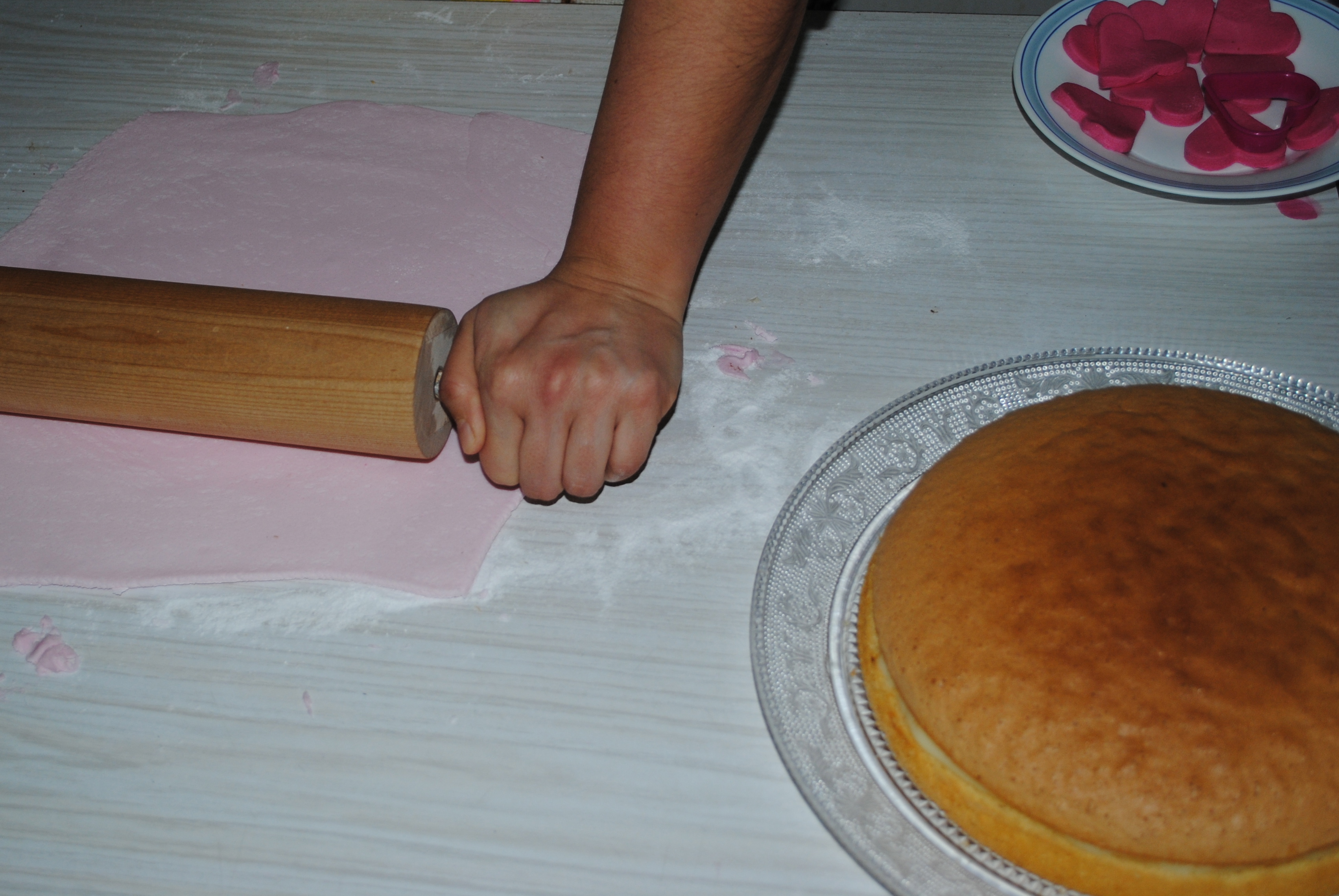 Ahora estiramos el trozo grande de fondant, procurar tener la mesa con una capa de azúcar glass para que no se os pegue.