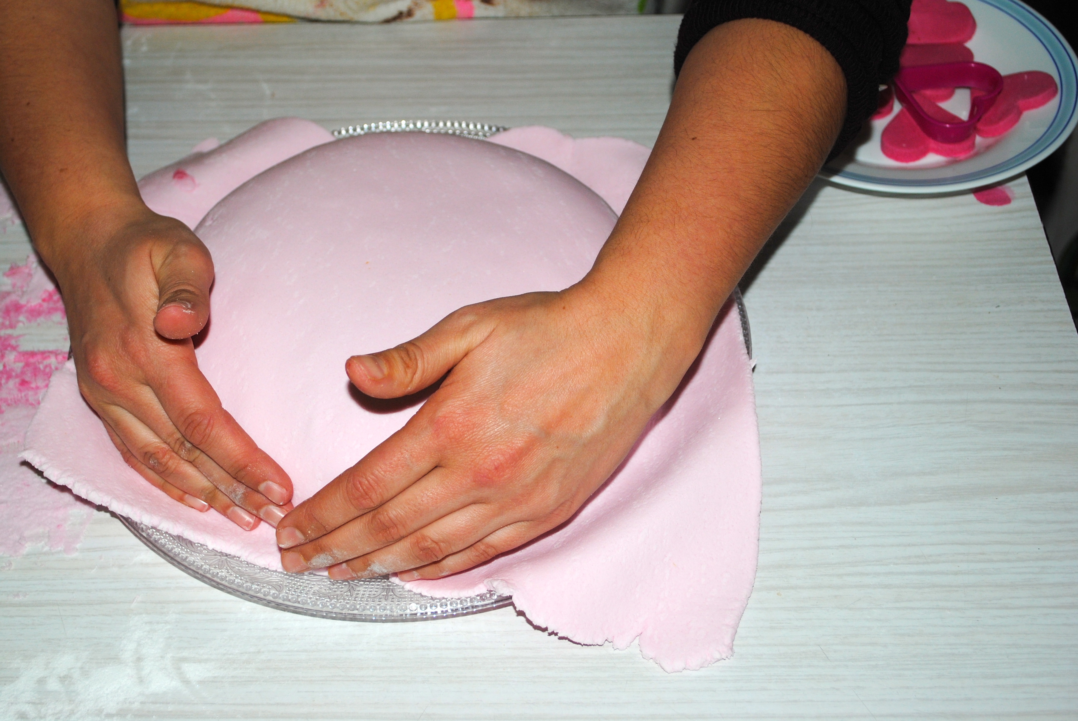 Toca alisar con las manos e ir dando la forma del pastel y cortando los sobrantes, no lo cortéis al ras dejar un trocito e introducirlo por debajo del pastel con mucho cuidad de que no se os rompa ( es muy delicado) para que al ir secando se os quede pegado.