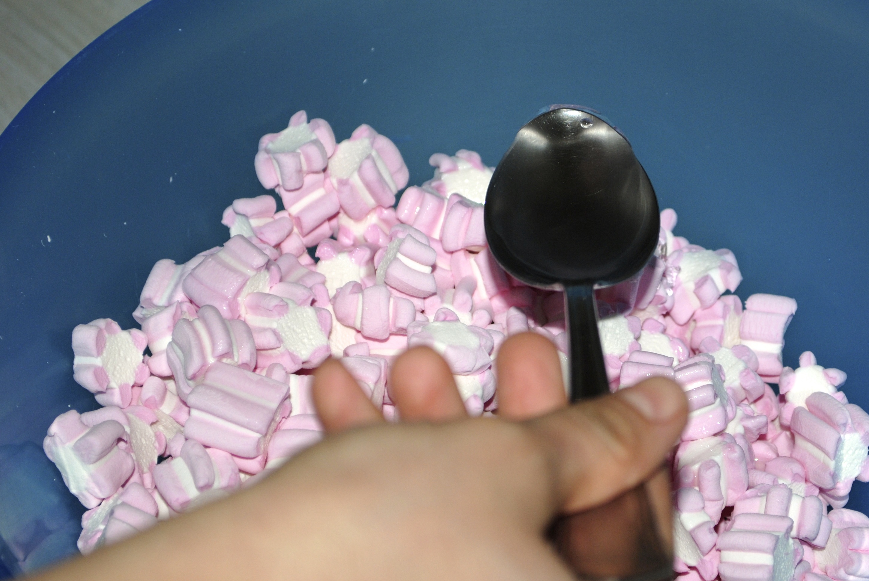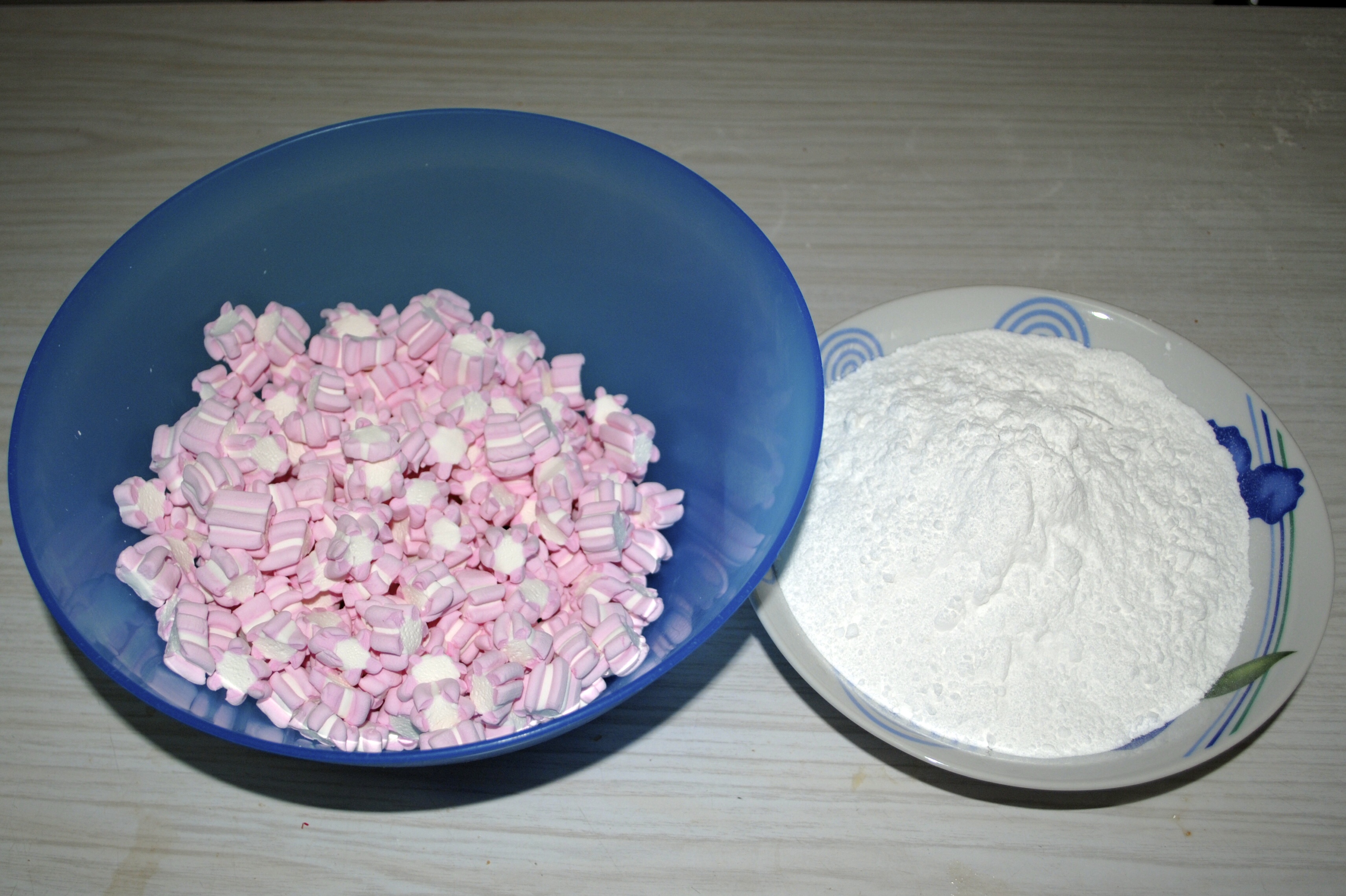 Troceamos las nubes o malvaviscos y las introducimos en un bol apto para microondas, si el bol no es de plastico untarlo con una fina capa de margarina para que no se os pegue
