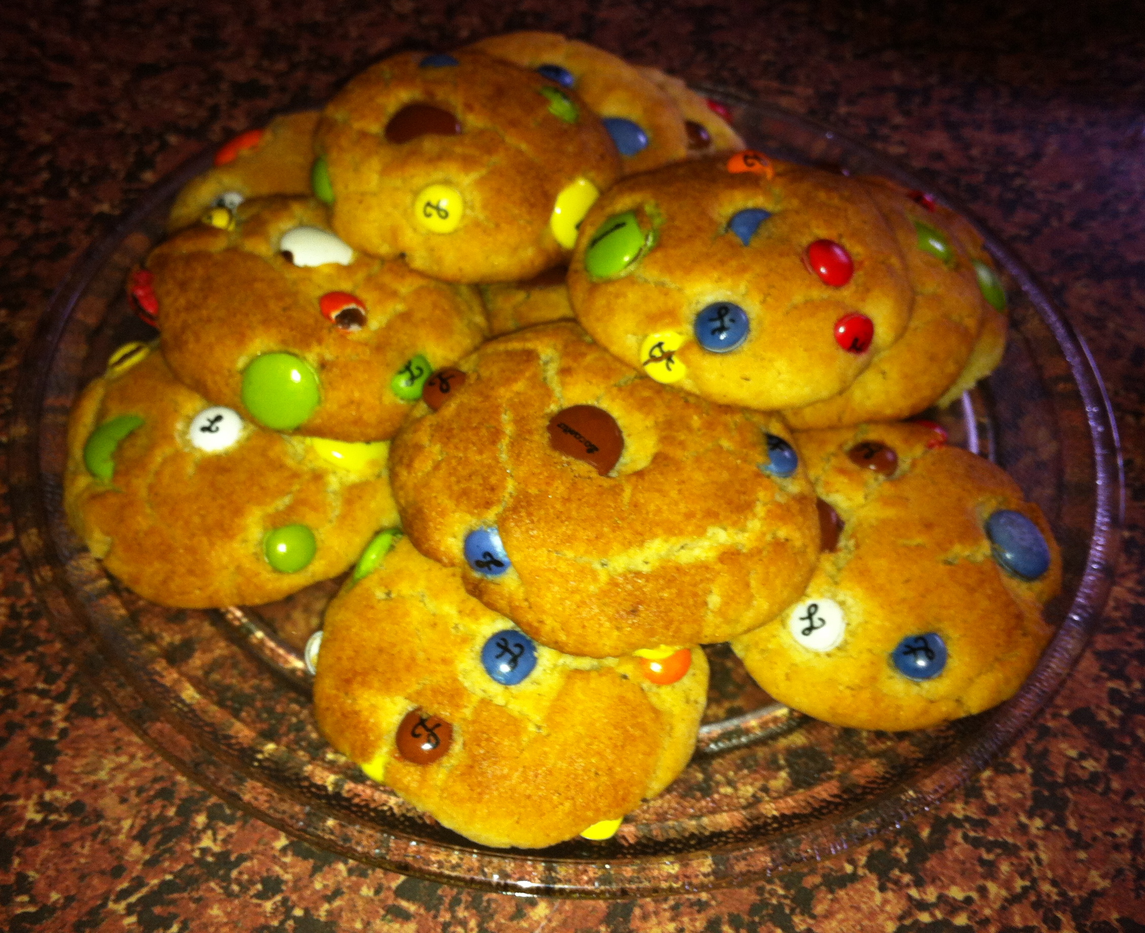Batir la mantequilla con el azucar y la vainilla, cuando este bien mezclado añadimos el huevo y seguimos batiendo para incorporar el bicarbonato y la levadura, con todo bien mezclado vamos añadiendo la harina hasta crear una masa de galletas con la que iremos haciendo bolitas e incrustandoles lacasitos (unos 6 por galleta) y poniéndolas en la placa cubierta con papel de horno y con tres dedos de separación entre ella porque crecen bastante, con ellas colocadas las aplastamos un poco y horneamos a 180º en horno precalentado hasta que estén doradas, unos 15 minutos dependiendo del tipo de horno. Las sacamos y con mucho cuidado porque están muy blandas las ponemos en una fuente lisa y las dejamos enfriar