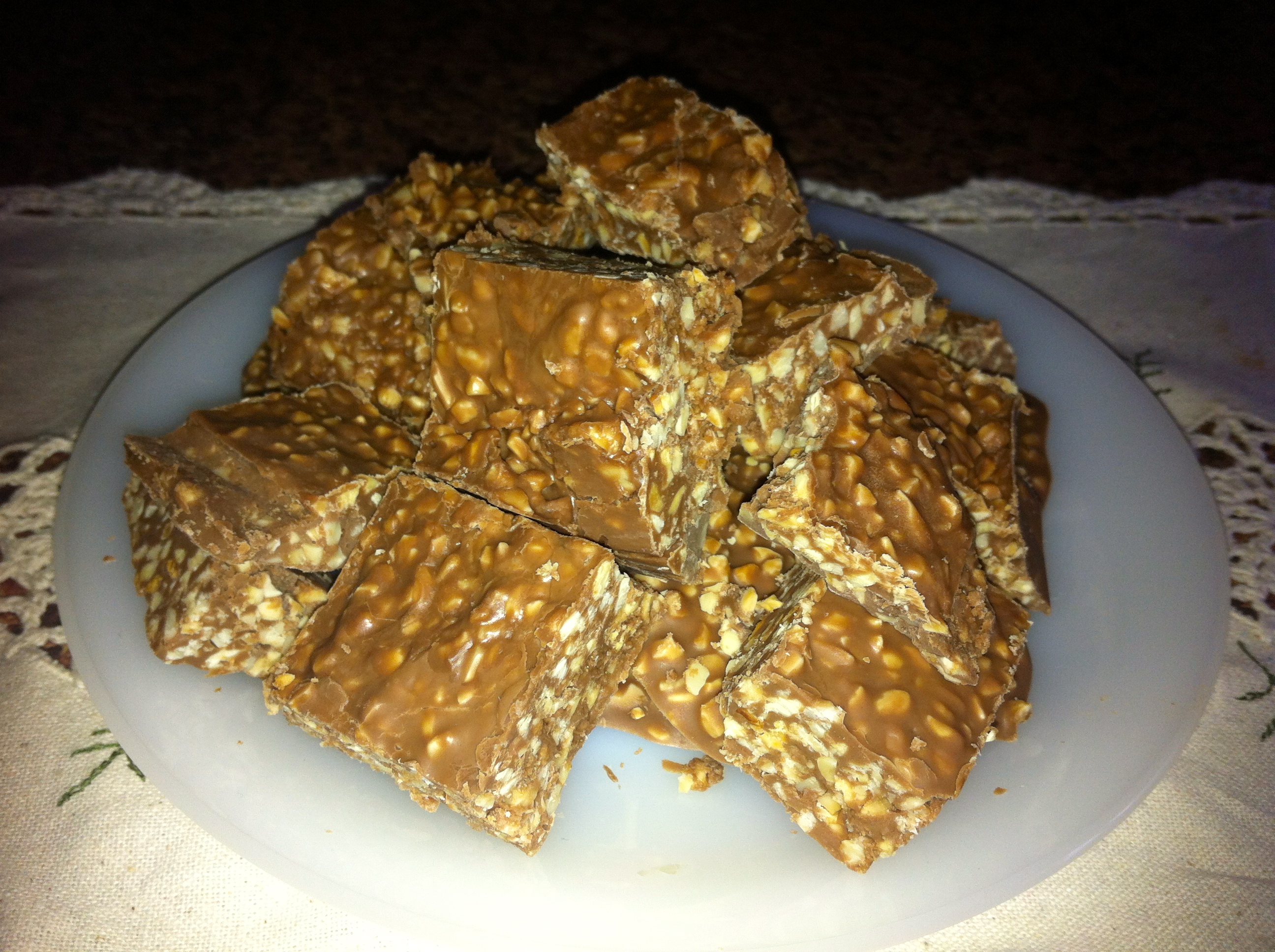 Fundimos al baño maria la cobertura de chocolate que hayamos elegido, cuando este fundida añadimos la manteca de cacao y dejamos que se funda con el chocolate para agregar el granillo de almendra o avellana con ello mezclado hacemos montoncitos que dejamos enfriar para obtener nuestros bombones roca.