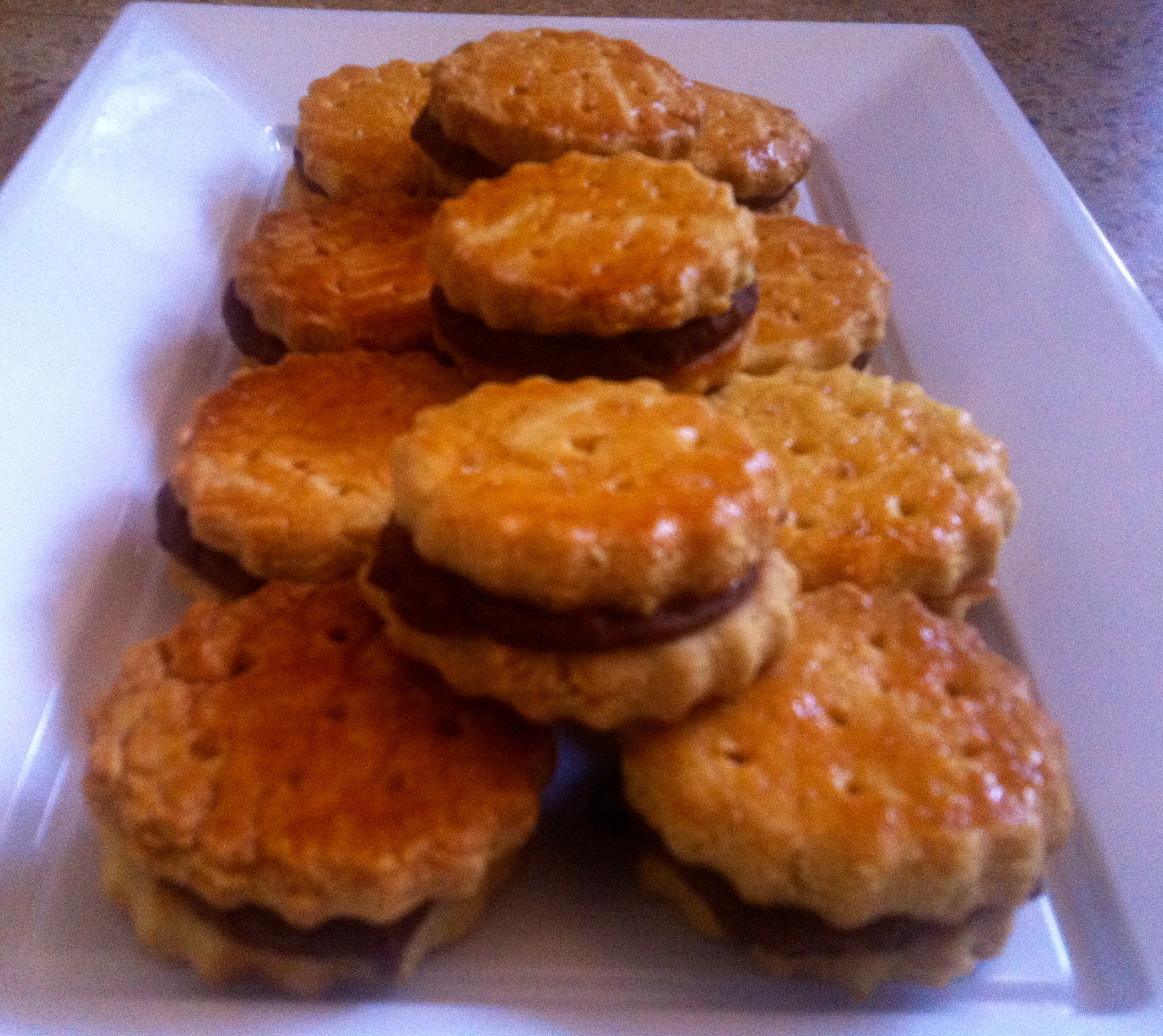 Vamos mezclando por este orden los ingredientes, la harina, la almendra, la sal, los azucares, la mantequilla y la yema. Al principio cuando integréis la mantequilla se os va a poner algo pringoso así que podéis ayudaros con unas varillas eléctricas para que cuando incorporéis la yema ya sea una masa manejable, con la masa ya compactada la envolvéis en papel film bien cubierto durante 1/2 hora en la nevera, pasado ese tiempo en una superficie enharinada y con la ayuda de un rodillo vamos a estirar la masa de las galletas con un grosor de medio dedo, ahora con la ayuda de un cortador de galletas redondo vamos haciendo las galletas, con ellas cortadas y con la ayuda de un palillo les hacéis agujeros en toda la superficie, las colocáis en una bandeja de horno cubierta con papel y con el huevo batido las pintáis para introducirlas en el horno precalentado a 180º hasta que se os pongan doradas, las sacáis del horno y dejáis enfriar, mientras enfrían en un cazo ponemos el chocolate con la nata y lo fundís una vez hecho vais colocando una cucharadita en el centro de una galleta y cubriendo con otra apretando un poco para que se distribuya bien la crema de chocolate y así con todas las galletas hasta terminarlas.