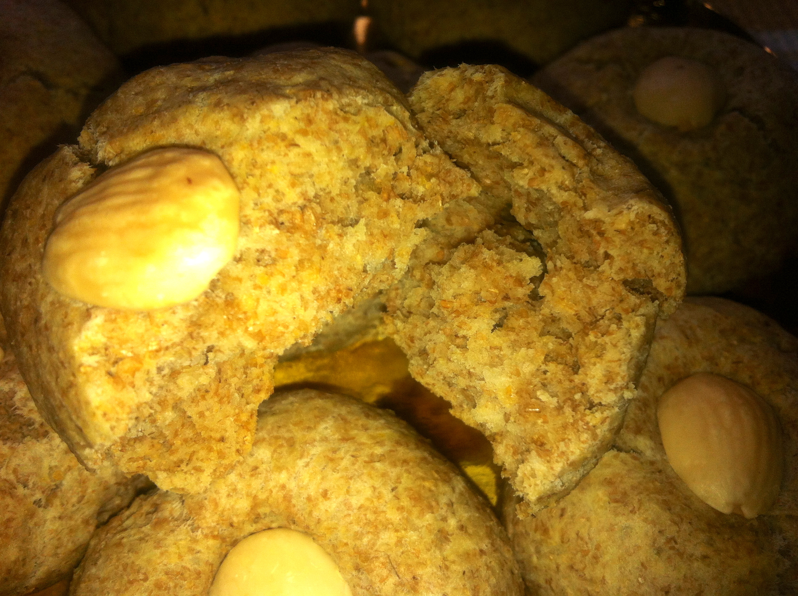 Fundimos la margarina en el micro y lo mezclamos con los huevos batiendo con energia para añadir el edulcorante, la sal y la ralladura de limón, con todo bien unido vamos añadiendo la harina integral hasta crear una bola algo pegajosa, ahora vamos haciendo bolitas y colocándolas en una placa de horno cubierta con papel de hornear les dejamos separación y les ponemos una almendra encima apretando hacia abajo, cuando tengamos las galletas colocadas las horneamos a 180º durante 15 minutos o cuando veáis que se ponen doradas y ya tenéis unas galletas muy ricas y no engordan!!.