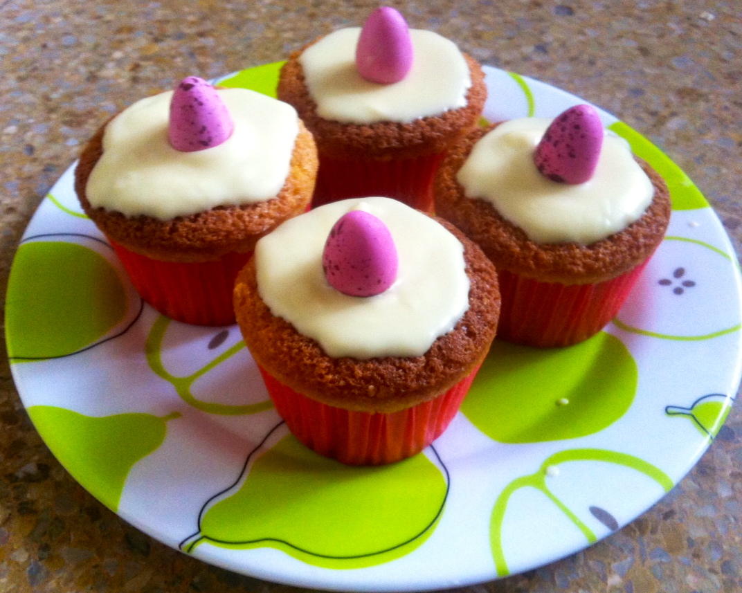 Con unas varillas eléctricas mezclamos todos los ingredientes menos la harina y el chocolate, cuando estén bien mezclados vamos añadiendo poco a poco la harina y cuando no haya ningún grumos vamos rellenando los moldes sin sobrepasar nunca la mitad y horneamos a 180º en horno precalentado arriba y abajo unos 20 minutos aproximadamente, pinchamos uno y si sale seco retiramos del horno y dejamos enfriar, cuando estén todos hechos y fríos fundimos al baño María el chocolate blanco y cubrimos la parte de arriba de nuestros muffins, cuando veáis que esta cuajado ya los podéis comer!!!