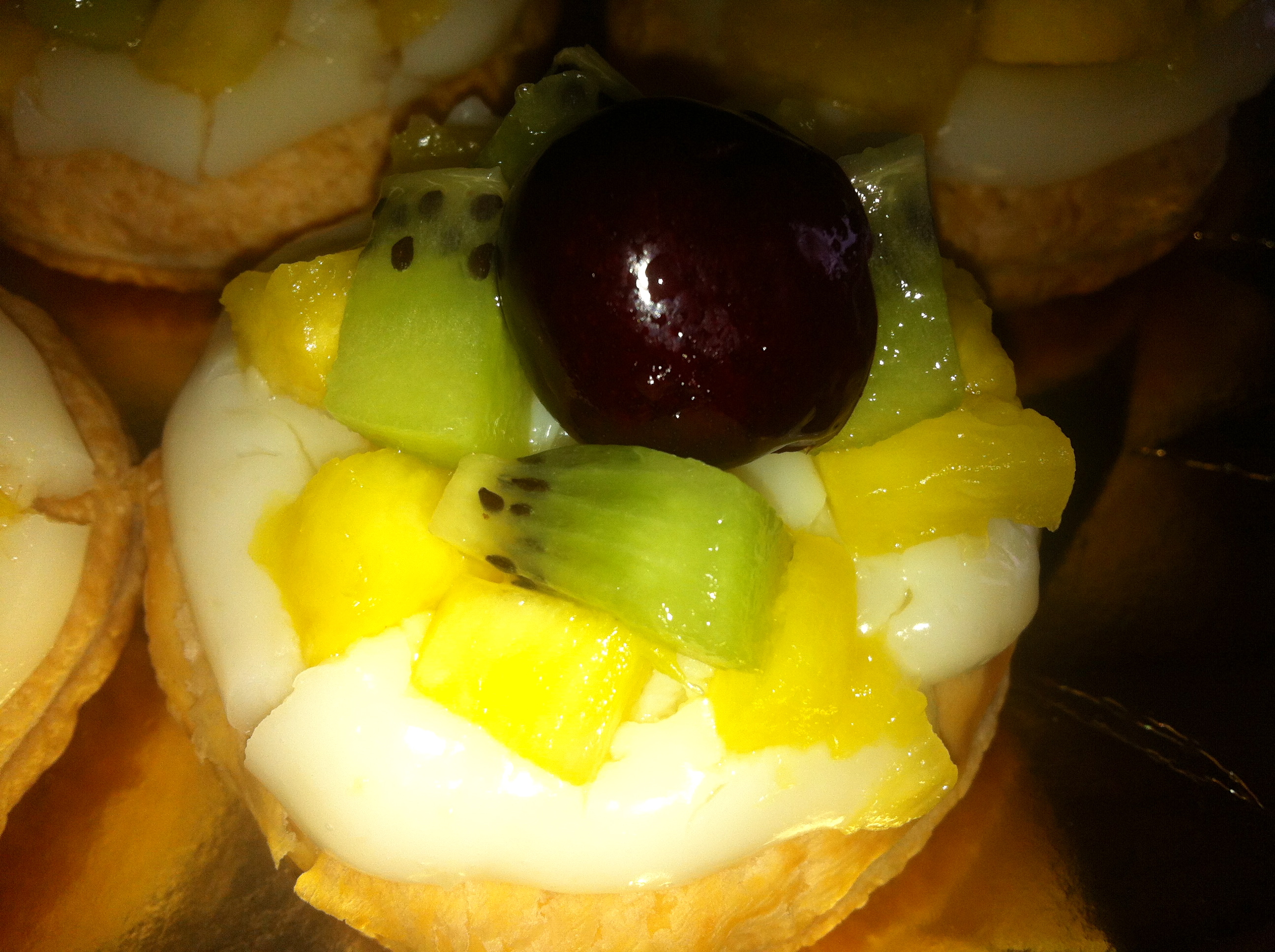 Estiramos el hojaldre y con un cortador redondo vamos haciendo círculos que pinchamos para que no nos suban mucho a la hora de hornear, los colocamos en una placa de horno cubierta con papel de hornear y los cocemos a 180º en horno precalentado arriba y abajo hasta que veáis que se ponen dorador (pincharlos muy bien para que no suban mucho), una vez que estén todas nuestras bases cocidas y frías vamos colocando la crema pastelera con la ayuda de una manga pastelera y antes de que este muy fría poniendo la fruta como mas os guste. Ahora deshacemos la gelatina en la taza de agua (que sea grande y este templada) con el azucar y vamos bañando nuestros pasteles, con ello evitamos que la fruta se oxide y quedan muy bien.