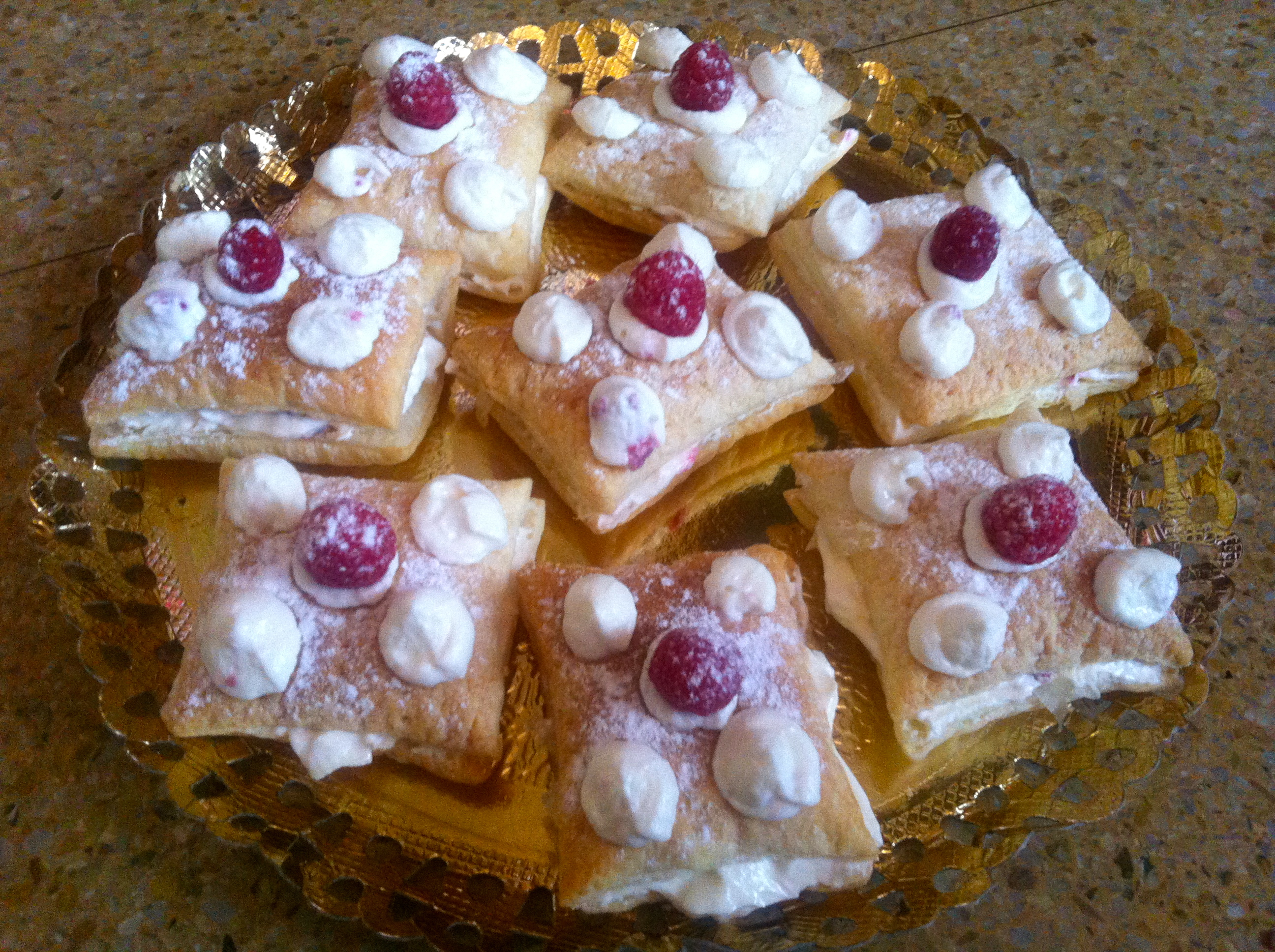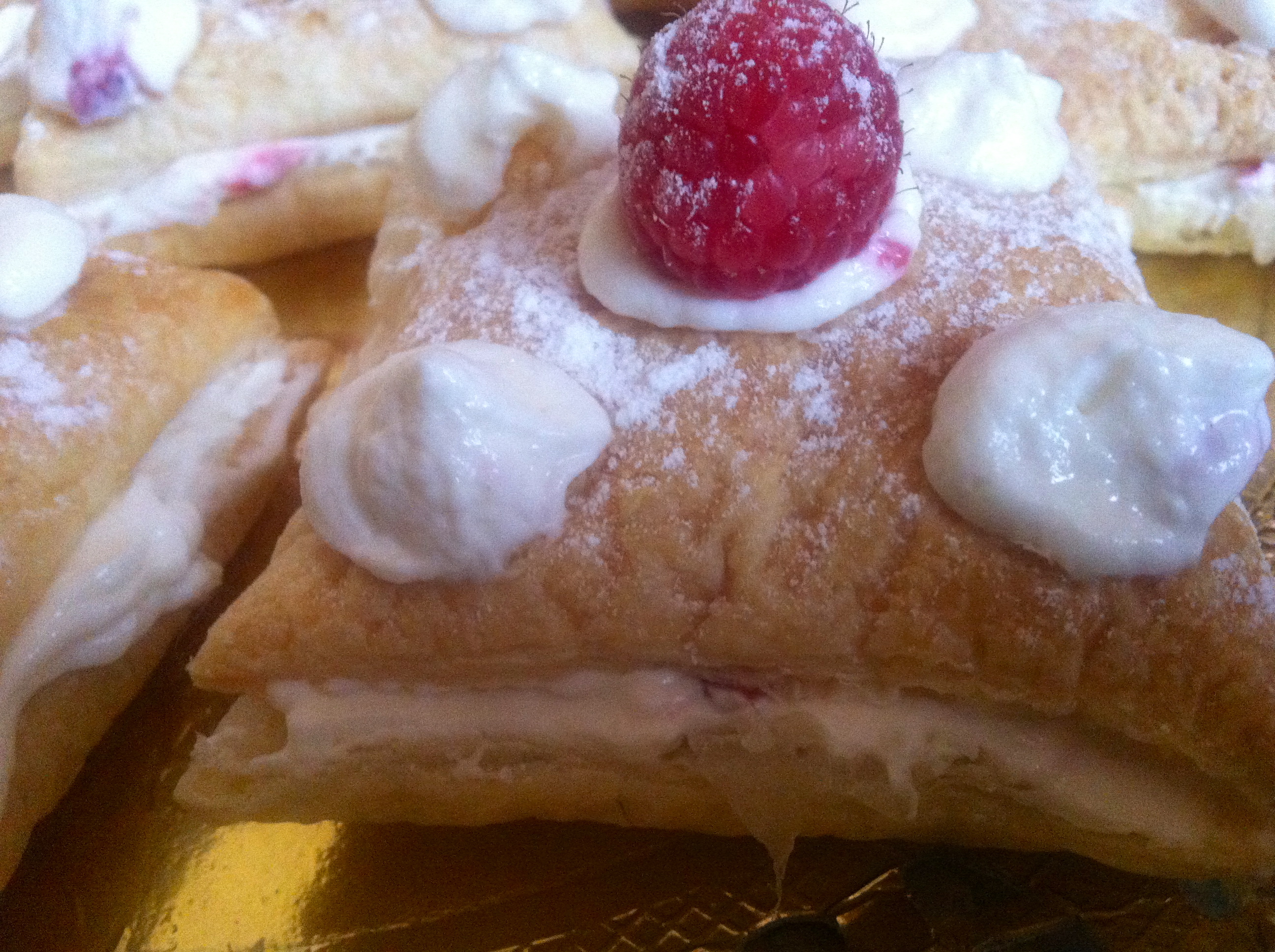 Cortamos el hojaldre en cuadrados todos iguales, superponemos uno sobre otro creando grupos de dos, los sellamos bien y horneamos a 180º en horno precalentado hasta que veamos que doblan el tamaño y están dorados, los sacamos y dejamos enfriar. Ahora mezclamos la nata con el queso y el azucar glass y con unas varillas eléctricas batimos hasta que tengan una textura compacta a la que añadimos unas cuantas la mitad de las frambuesas y mezclamos bien para que mezcle el sabor. Una vez hecho el relleno cogemos los hojaldres y con un cuchillo y muchísimo cuidado vamos abriendo por la mitad los hojaldres y rellenando con la crema, (dejar un poco de crema para adornar los hojaldres por fuera)con todos rellenos los adornamos con lo que nos sobro de crema, la otra mitad de las frambuesas y un poco de azucar glass y listo fresquitos e ideales para un postre veraniego!!!!.