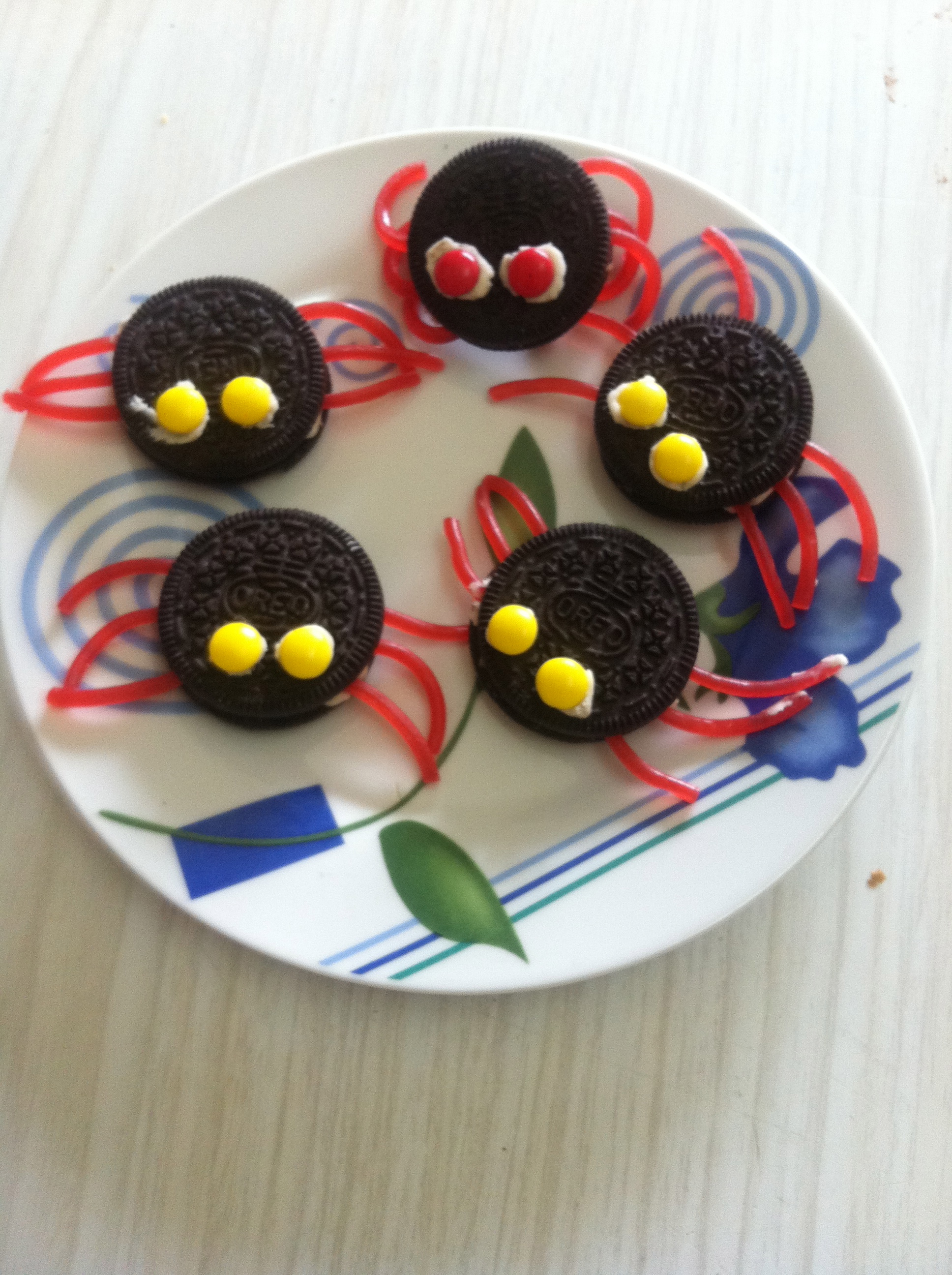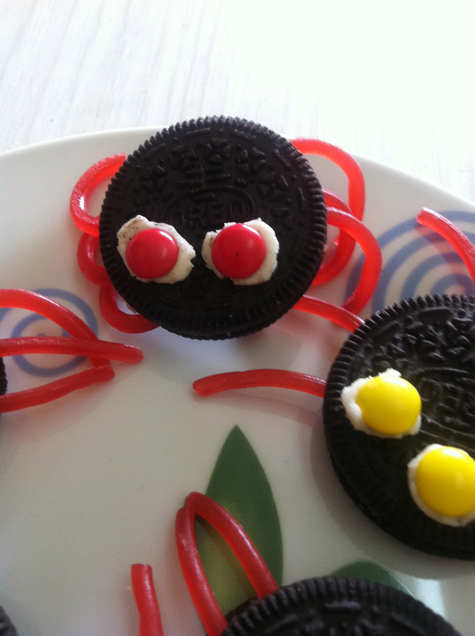 Despegamos las galletas procurando dejar crema en ambas partes, sacamos un poco de crema de cada galleta (pero muy poco) y reservamos esa crema, ahora vamos partiendo trocitos de regaliz rojo procurando que sean todos los trocitos igual, colocamos tres trocitos de cada lado de una de las galletas y colocamos la otra parte encima apretando un poco ( cuidado que no se rompa la galleta), cuando tengamos todas las patitas puestas vamos a ponerles los ojos con la crema que habíamos reservado cogiendo un poco y poniendo en las galletas para ponerles encima los minilacasitos que nos servirán de ojos y listo ya tenemos unas ricas arañitas de Halloween!!!!