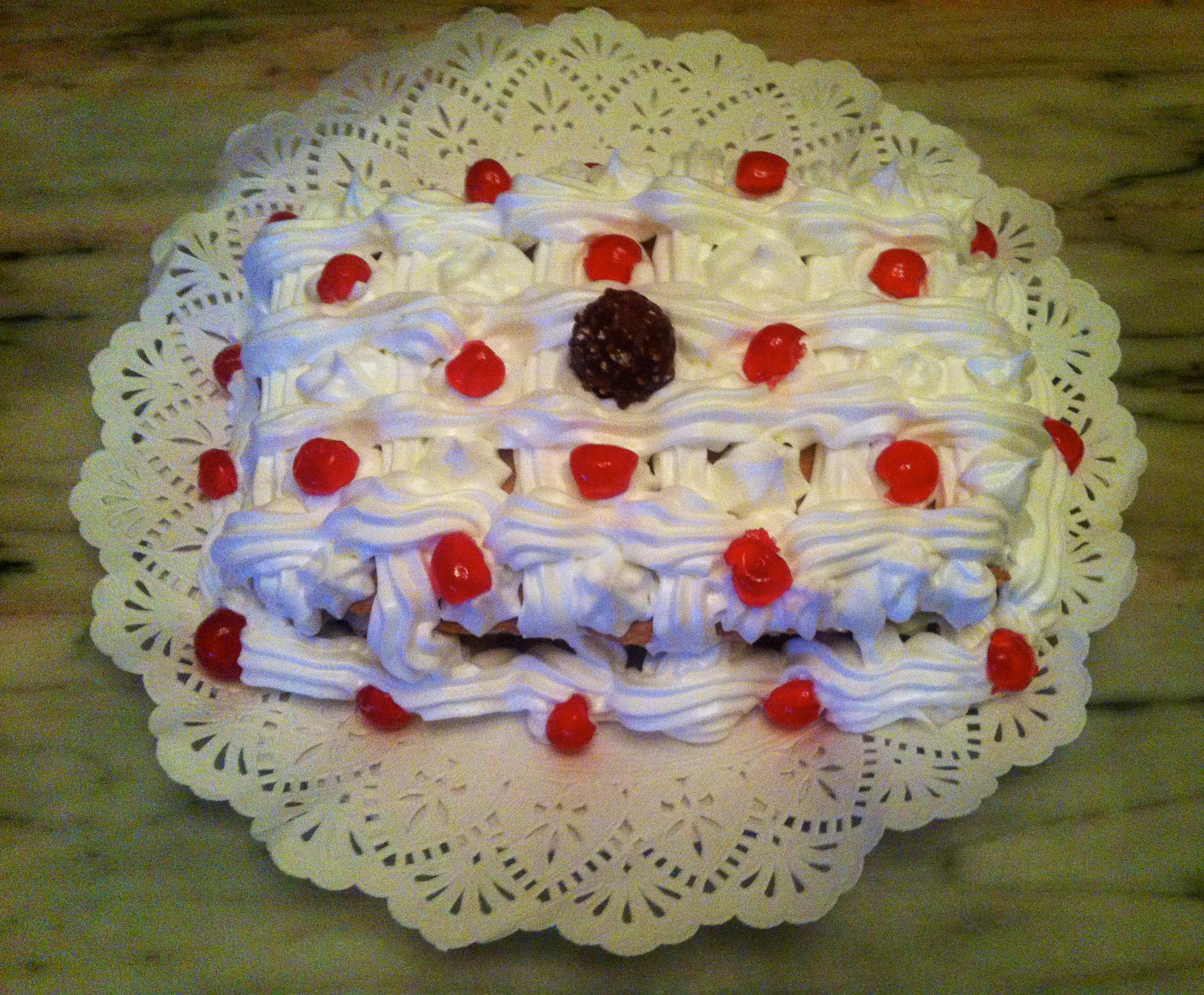 Ahora nos vamos a poner a formar nuestra tarta para lo que ponemos una base y cubrimos con la mitad de la crema de vainilla, colocamos otra base y ponemos toda la crema de chocolate volvemos a poner otra base y ponemos el resto de la crema de vainilla y otra capa para adornarla. Montamos las claras a punto de nieve (que os quede bien duras) y le vamos incorporando el azucar glass para que queden mas duras aun, lo pasamos a una manga pastelera con boquilla rizada y vamos trazando lineas cubriendo todo el pastel incluidos las paredes primero en una dirección y luego en otra, en los cuadrados de la parte de arriba de la tarta que os van quedando hacéis montoncitos de merengue, vais alternando una cereza cada dos y en el centro un bombón.