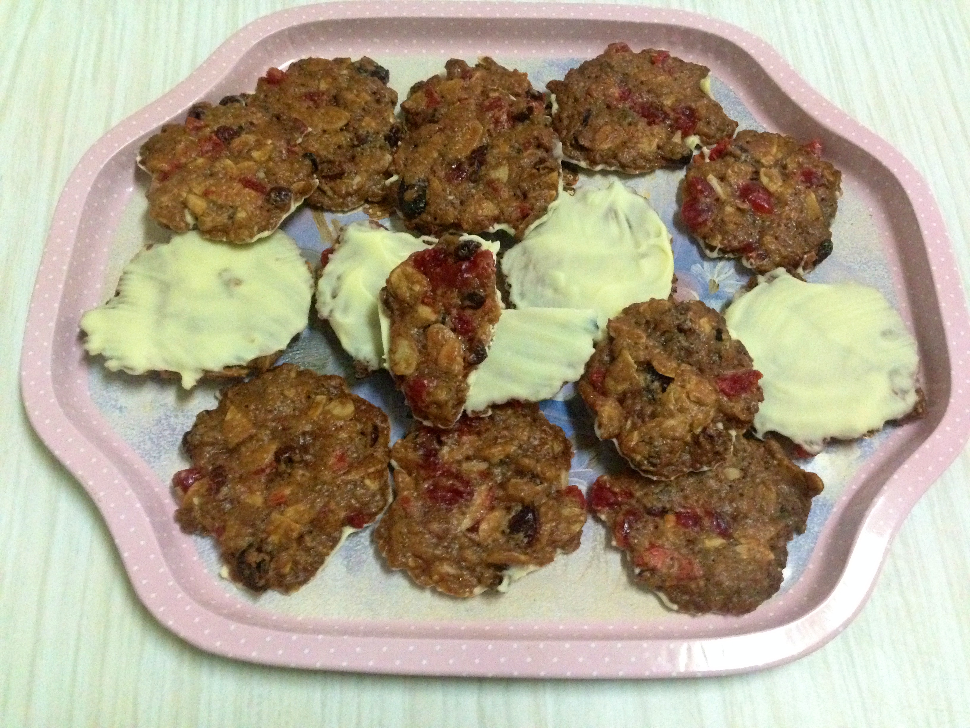 Empezamos poniendo a fuego muy bajo la mantequilla con el azucar hasta que nos quede una crema liquida, ahora lo retiramos del fuego y le vamos añadiendo la harina, removiendo para que no quede ningún grumo y continuamos añadiendo la almendra y las frutas hasta que quede una mas, cogemos dos cucharitas y vamos poniendo montoncitos encima de la placa del horno cubierta con papel vegetal, los ponemos separados y con un tenedor mojado en agua y los aplastamos todo lo que podamos, horneamos a 180º en horno precalentado durante 10 minutos y con una espátula los vamos sacando con mucho cuidado y colocando en una rejilla para que enfríen, cuando ya tengamos todas nuestra galletitas hechas y mientras que enfrían ponemos la cobertura blanca al baño maria, con el fundido cogemos una brocha y bañamos las bases de todas la galletas, dejamos que sequen poniendo el chocolate hacia arriba para que no gotee y listas para comer.