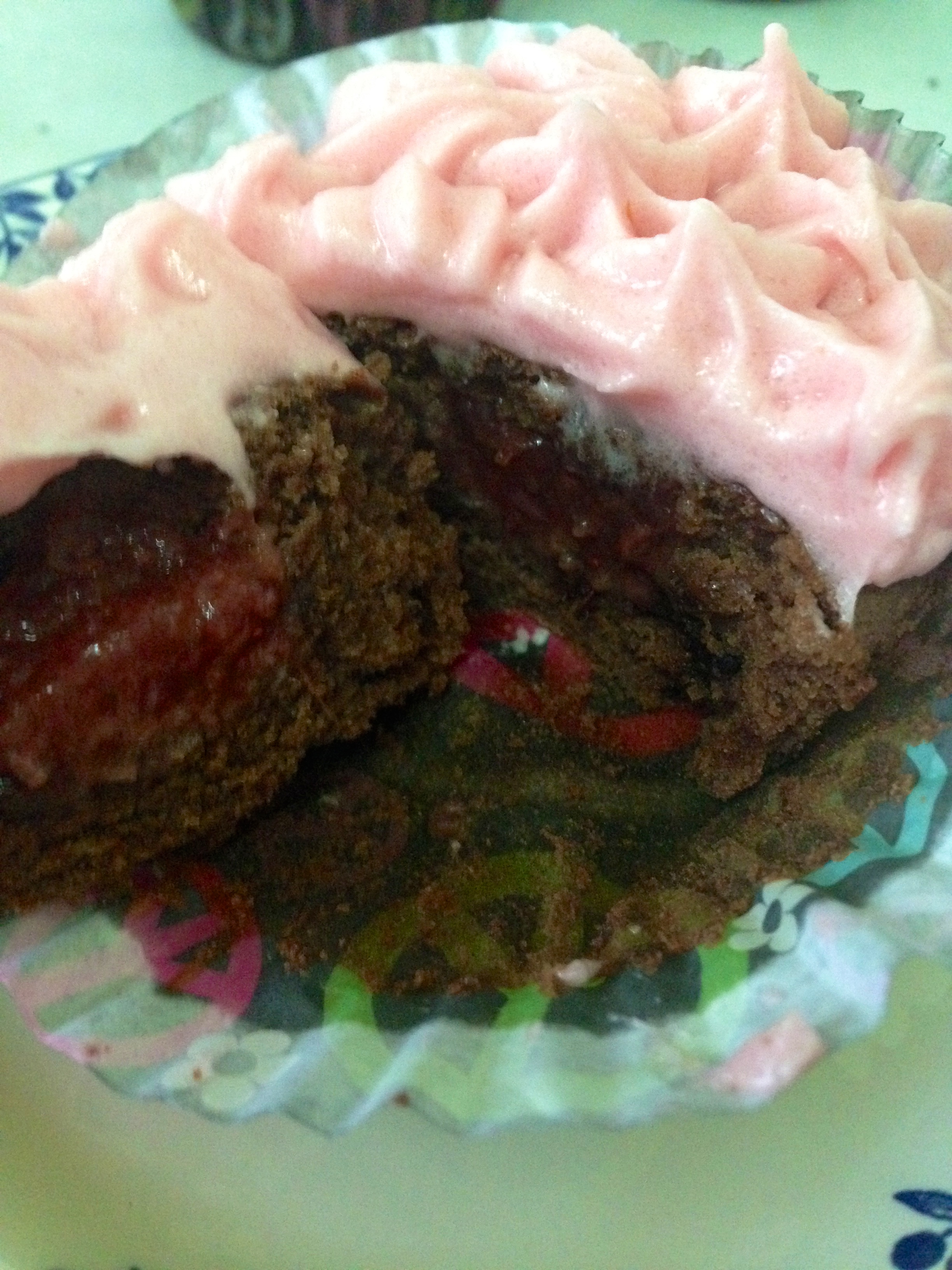 Vamos a empezar por preparar los bizcochitos para lo que ponemos en un bol alto (todo la masa del bizcocho va batido con varillas eléctricas) el azucar con la mantequilla, batimos hasta crear una crema que le añadimos los huevos uno a uno e incorporando bien, ahora la leche y la crema agria, con ella bien incorporada añadimos el cacao, la harina, y la levadura que habremos tamizado todo junto previamente, con la masa creada le incorporamos las chispas de chocolate. Ponemos el horno a precalentar a 170º y mientras vamos preparando las cápsulas de papel para los cupcakes y los rellenamos 3/4, con el horno precalentado los introducimos y los horneamos unos 20 minutos, pasado ese tiempo comprobamos pinchando en el centro y si sale seco los retiramos y dejamos enfriar, cuando ya los tengamos todos hechos y fríos con un descorazonador de manzanas vamos haciendo agujeros sin llegar hasta abajo y los rellenamos con un poco de mermelada , cogemos un poco de lo que sacamos con el descorazonador y lo usamos a modo de tapón.