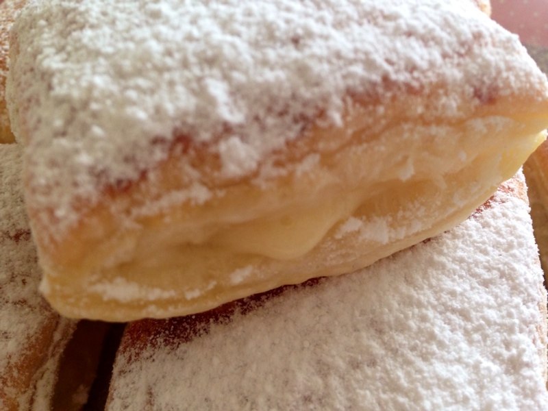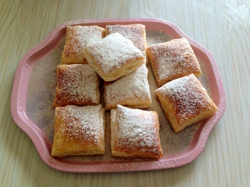Lo primero que haremos es preparar el hojaldre para lo que cortamos cuadrados todos iguales, con todo preparado y con ayuda de un poco de agua y un pincel vamos pegando el hojaldre de dos en dos, mientras lo vamos haciendo ponemos el horno a precalentar a 190º, ya tenemos los hojaldres preparados para hornear así que los vamos colocando en la placa del horno y los cocemos unos 10/15 minutos (depende de vuestro horno, cuando estén tostaditos los retiráis) los dejamos enfriar y mientras preparamos la crema.