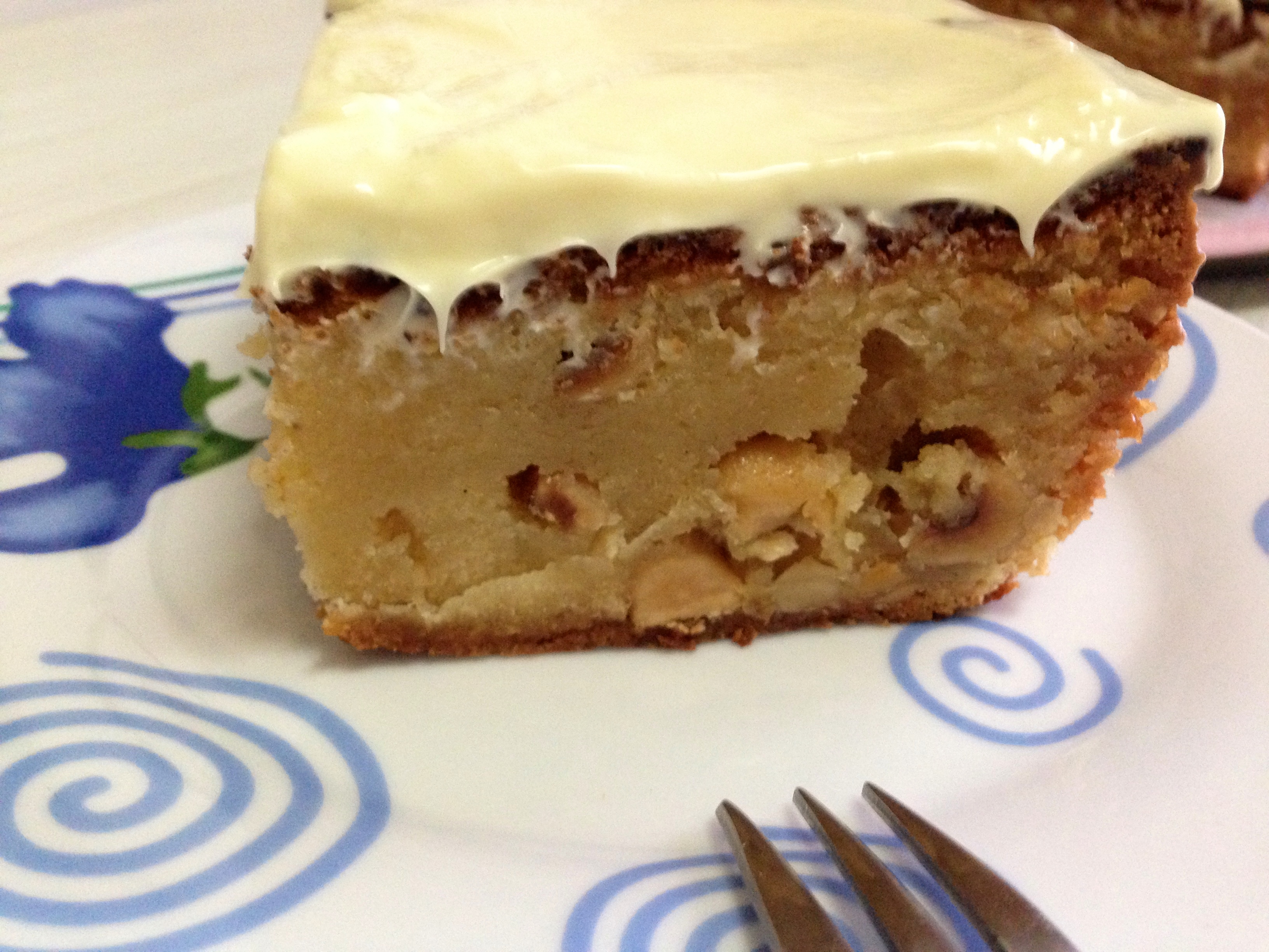Vamos a empezar poniendo el chocolate con la mantequilla al baño maria a fundir, una vez fundido lo apartamos del fuego pero lo dejamos con el baño para que no nos enfríe del todo y nos ponemos con el resto de los ingredientes. Ponemos en un bol alto el azucar con los huevos una vez que estén bien mezclados añadimos la mezcla del chocolate blanco, ahora la harina poco a poco y ya por ultimo los 100gr de avellanas picadas, lo pasamos a un molde de silicona o metal engrasado que sea cuadrado y lo horneamos en horno precalentado a 180º durante 40 minutos (si se pone muy dorado cubrir con papel de albal) pasado el tiempo pinchar en el centro y si sale seco retirar dejar enfriar para desmoldar y bañar con el chocolate blanco fundido al baño maria, dejar enfriar y a comer!!