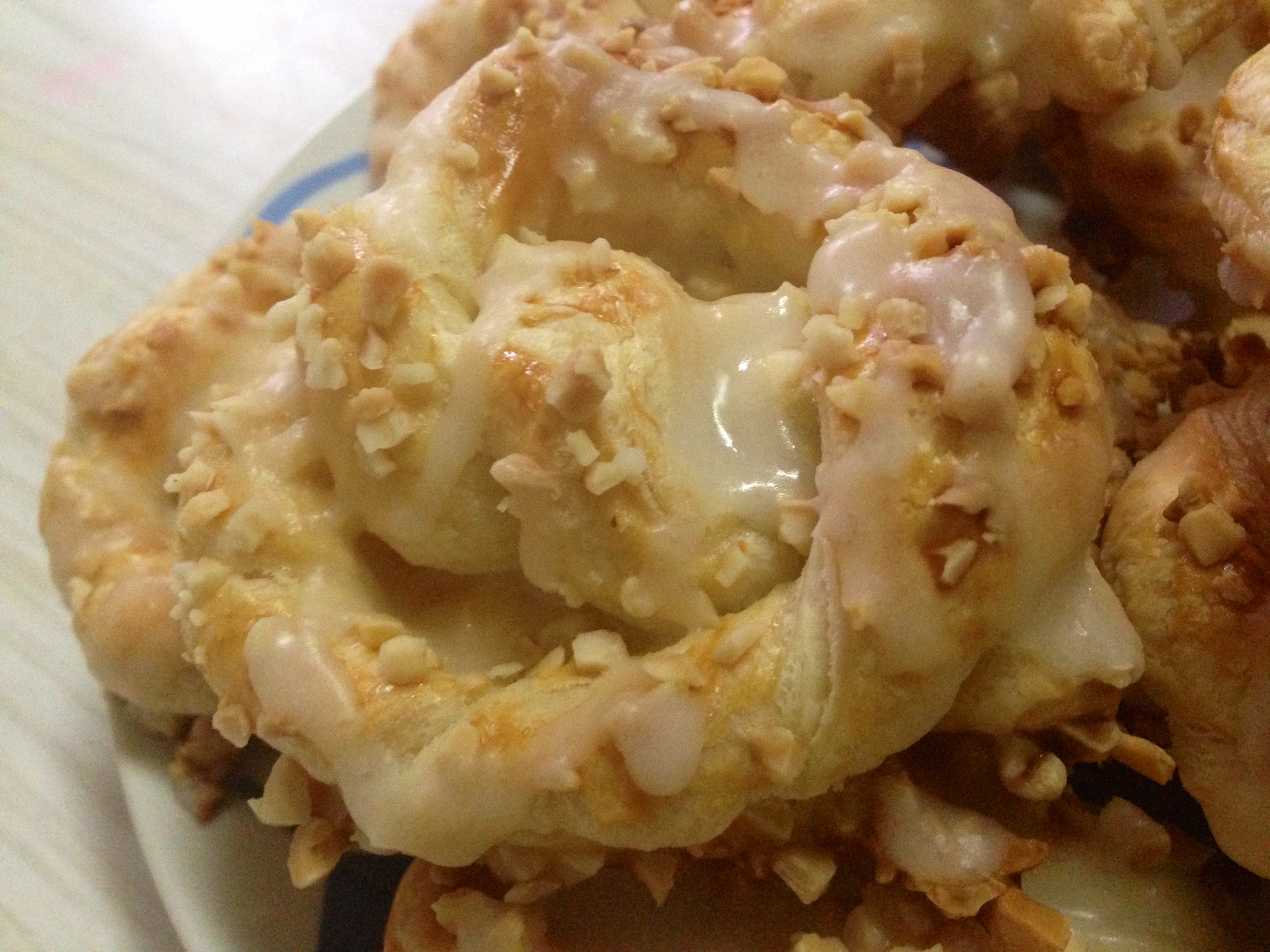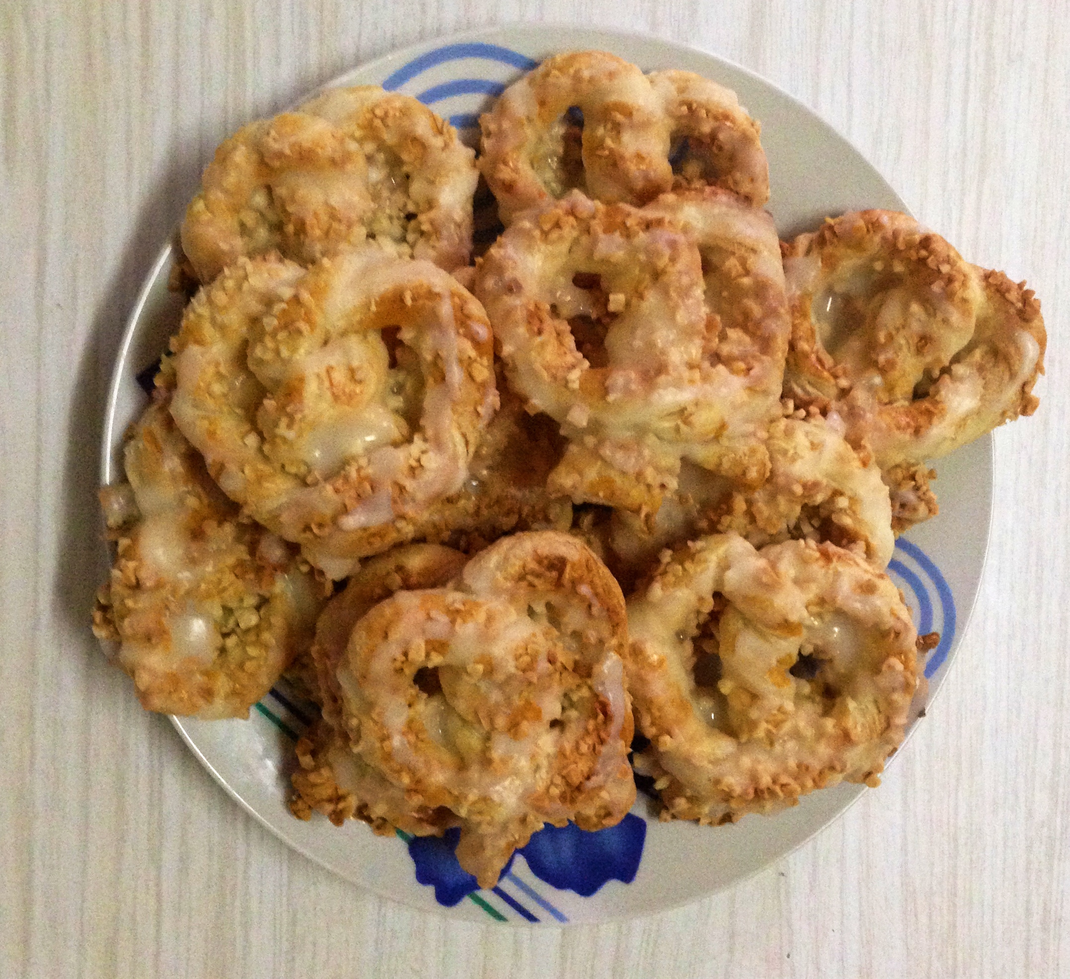 Ya tenemos la lazada, ponemos el horno a calentar a 180º, mientras calienta y ya colocados en en la placa del horno cubierta con papel y separados (crecen bastante) los barnizamos con el huevo, los rociamos con el granillo y los horneamos unos 20 minutos o hasta que los veamos doraditos. Cuando ya estén cocidos y mientras nos enfrían encima de una rejilla preparamos la glasa mezclando los dos ingredientes y creando una especie de merengue muy espeso (si no es bastante los 60gr de glass ir añadiendo de poco en poco hasta crear la textura deseada), bañamos las lazadas con la ayuda de una cucharita cubriendo toda la superficie, dejamos secar y listo para comer 😉