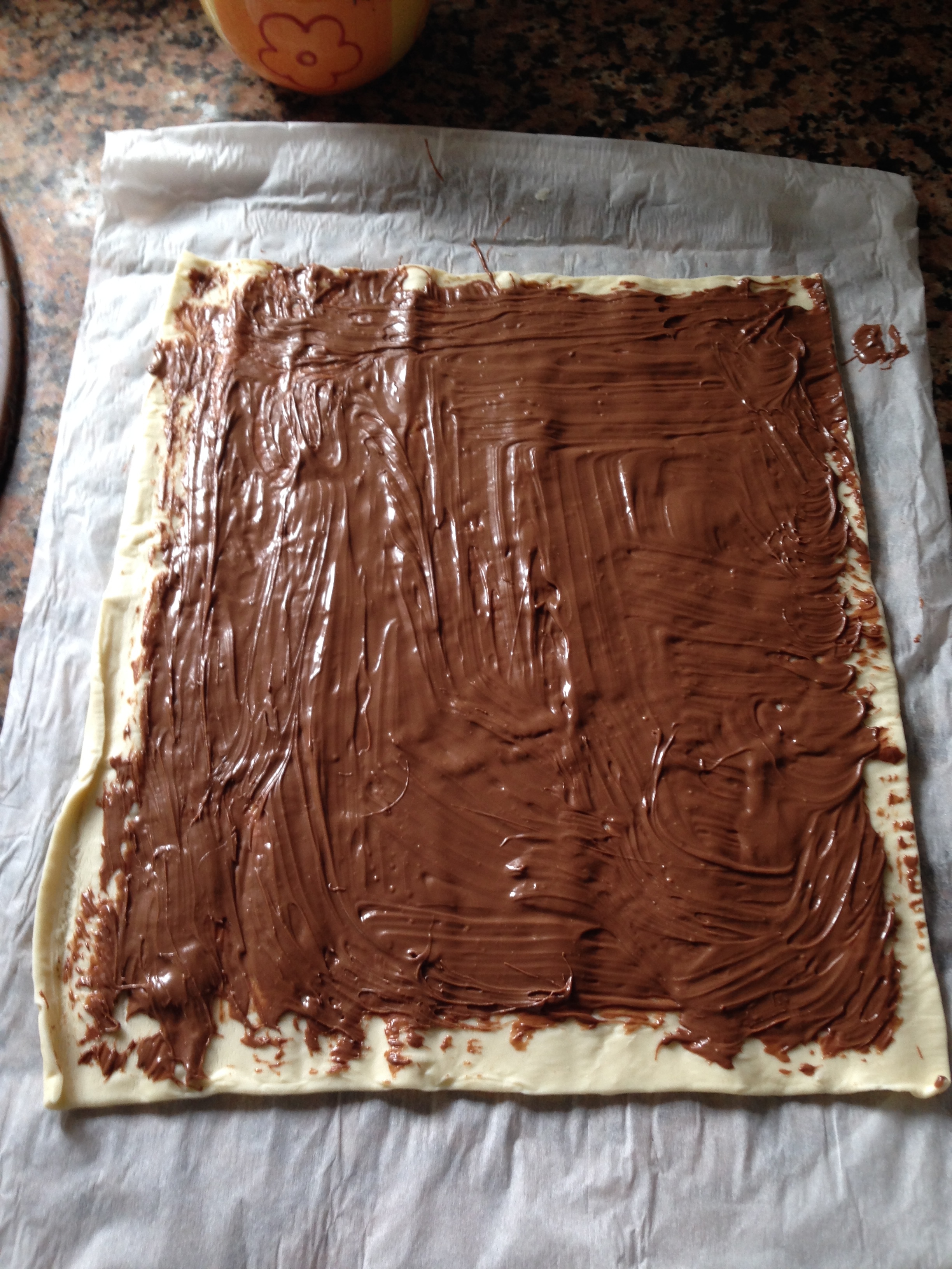 Lo primero estiramos la Nocilla (si esta dura darle un golpe de calor en el microondas para que sea mas fácil) igual que la foto sin tocar los bordes