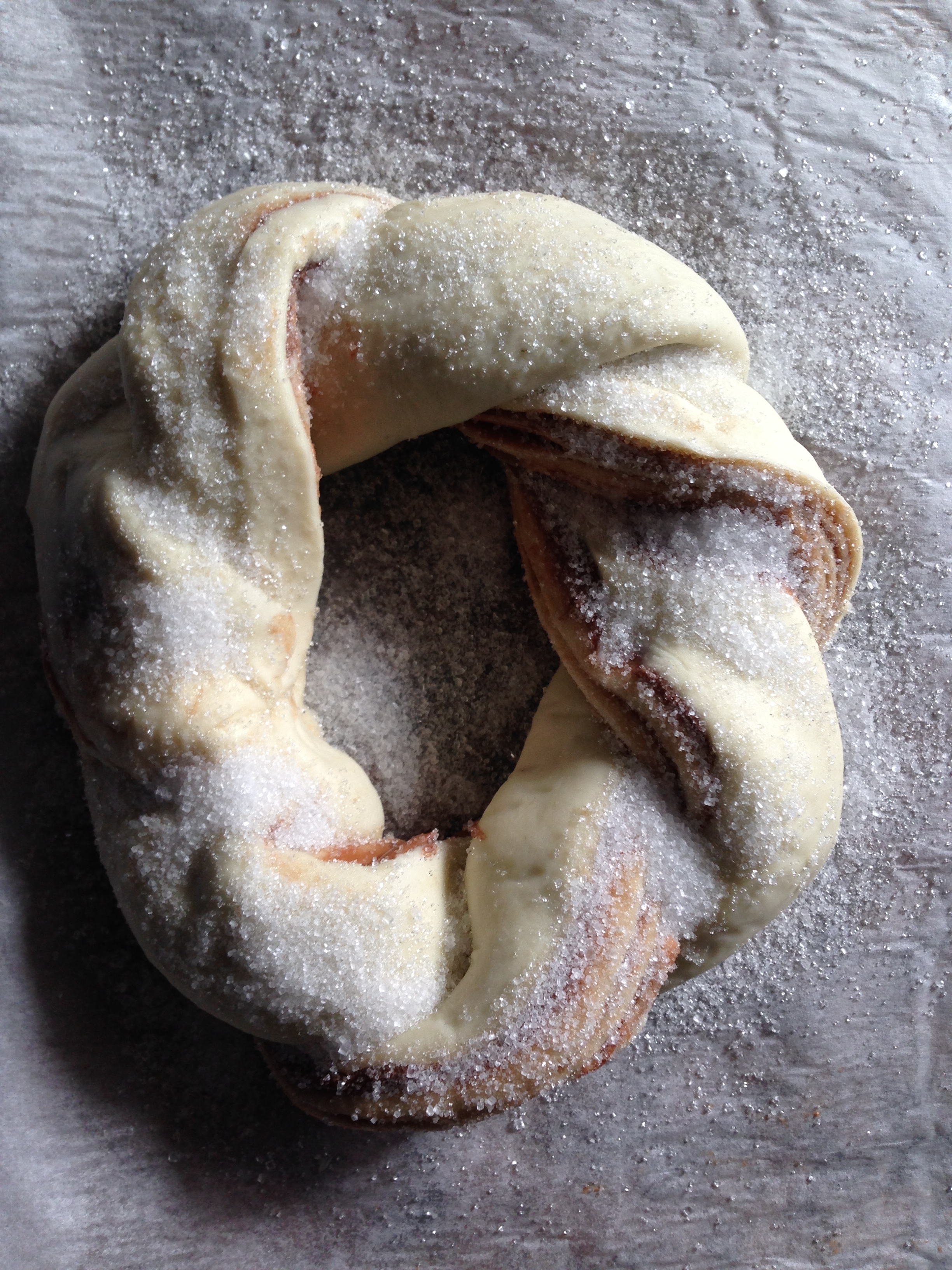 Juntamos las dos esquina procurando que el cierre quede hacia abajo, espolvoreamos con mucho azucar y en horno precalentado a 180º lo horneamos unos 20 minutos o hasta que veas que queda doradito