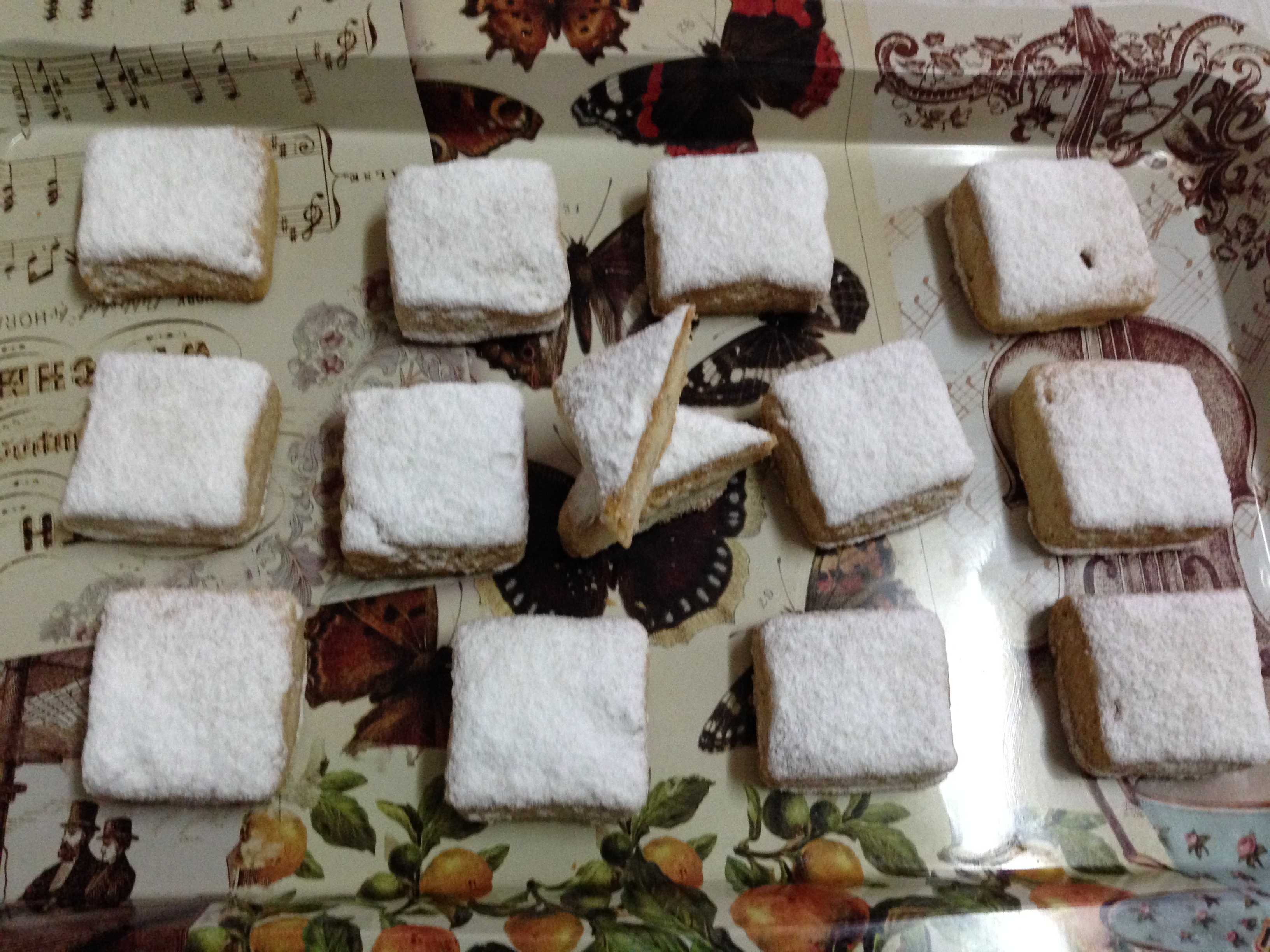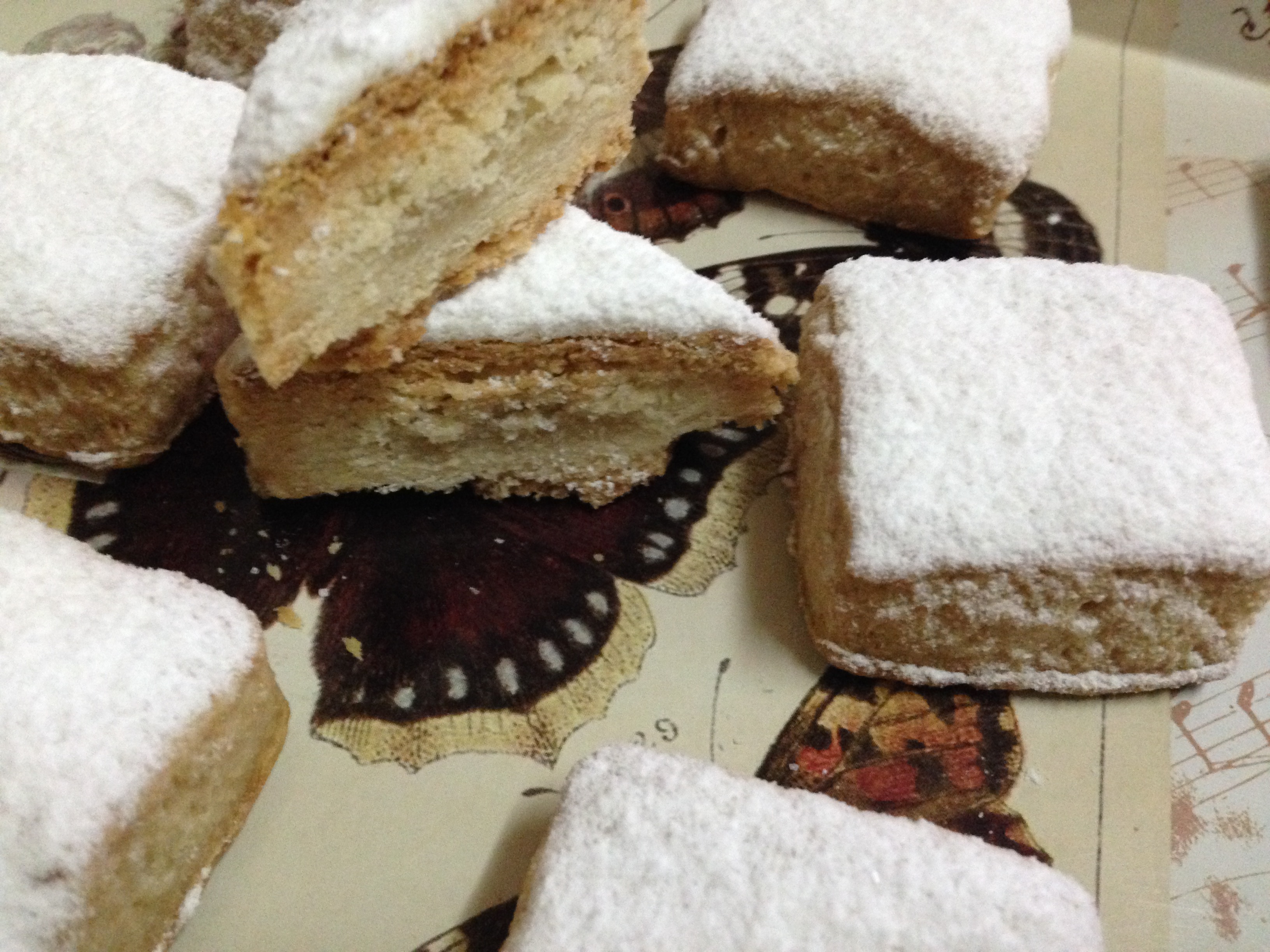 Lo primero que hacemos en fundir en el micro la manteca, le añadimos el vino y el zumo, batimos bien para que nos quede bien unido, ahora añadimos el azucar y la ralladura, ya por ultimo le incorporamos la harina y amasamos bien para crear una masa que envolvemos en film y llevamos 30 minutos a la nevera para que coja cuerpo. Pasado el tiempo sacamos, enharinamos la mesa y estiramos la masa en forma cuadrada, doblamos a la mitad en nuestra dirección y volvemos a estirar (siempre en la misma dirección), esto lo repetimos otras dos veces y volvemos a estirar dejando un grosor de dos dedos, ya tenemos la masa ahora cogemos un cobrador cuadrado (pequeño) y vamos cortado cuadraditos, los llevamos al horno a 200º (horno ya caliente) 15 minutos y luego 30 minutos mas a 175º y listo, retiramos del horno con cuidado que no se rompan, los colocamos en una rejilla y cuando este templados rebozamos con mucho azucar glass, Listo!!!! ya tenemos las hojaldradas navideñas 😉
