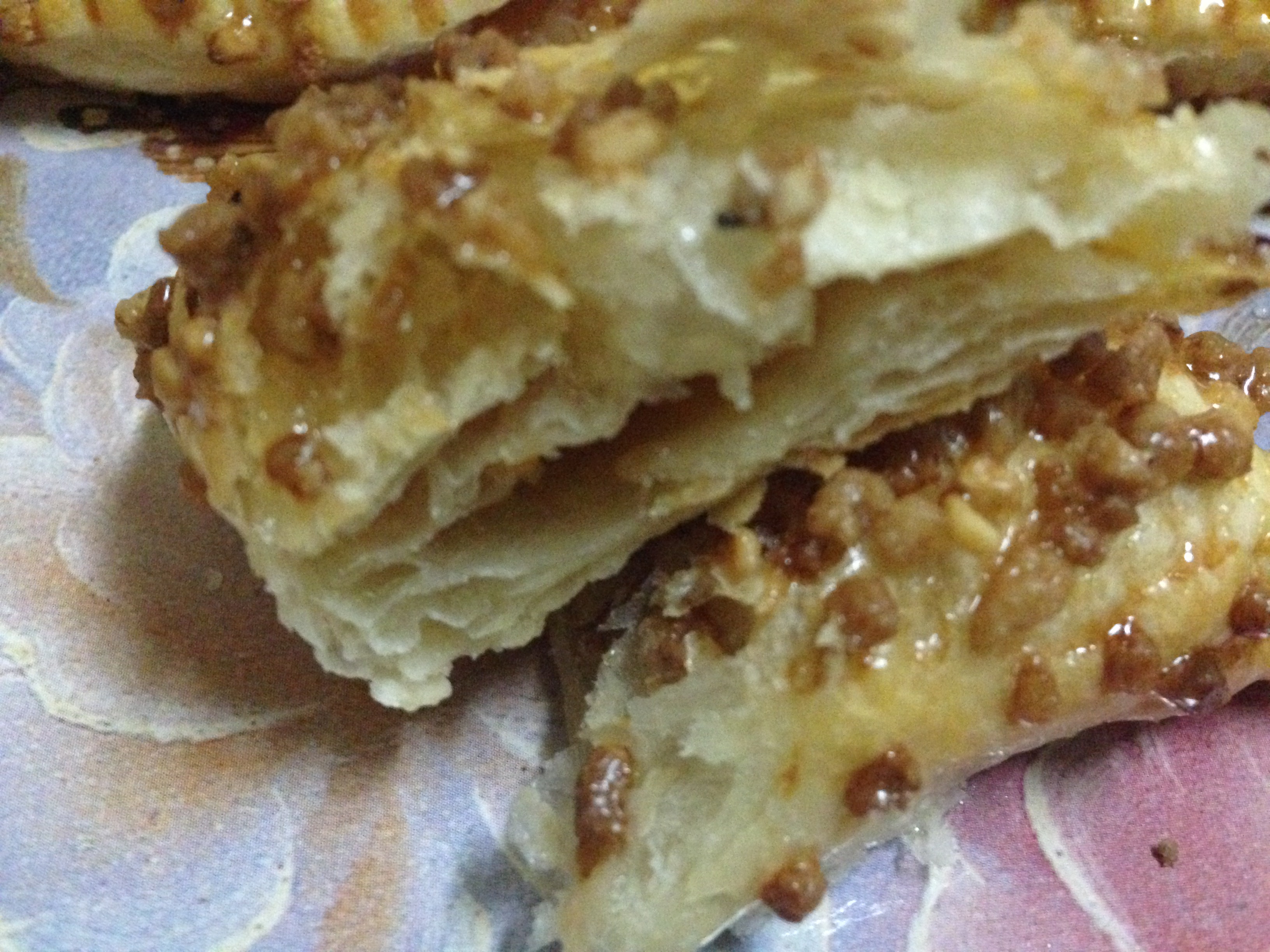 Lo primero que hacemos es cortar en trocitos muy pequeños el turro, lo juntamos con la nata y lo pasamos por la batidora hasta que nos quede una pasta, ahora cogemos el hojaldre, con un corta pasta redondo vamos haciendo círculos, en el centro de cada uno ponemos un poco de la crema de turrón (no pongas mucho que se os puede salir por los bordes), cerramos bien todos los bordes con la ayuda de un tenedor, pintamos con el huevo batido (con ellos ya colocados en la placa de horno), mientras pintamos ya tenemos el horno calentando a 200º, con ellos pintados rociamos por encima con la almendra horneamos unos 15 minutos o hasta que veas que están bien doraditos, los dejamos enfriar en una rejilla y mientras enfriar preparamos un almibar poniendo al fuego el agua con el azucar hasta que tengamos un almibar duro (vamos que nos quede un hilo entre los dedos cuando lo toquemos), lo retiramos y con una brocha los pincelamos dejamos que seque y listos para comer.
