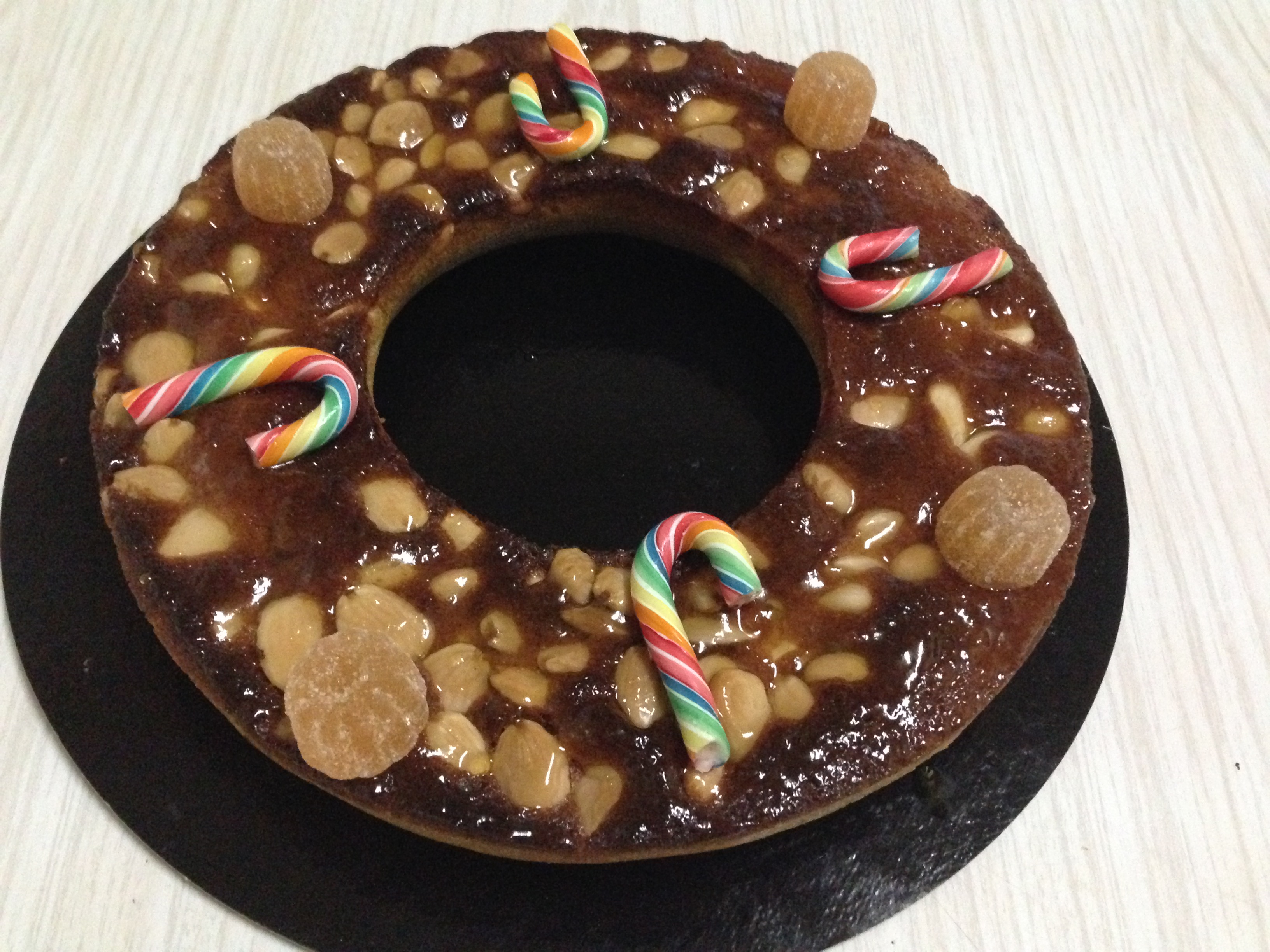 Empezamos batiendo la mantequilla con los azucares hasta crear una crema a la que le vamos añadiendo los huevos uno a uno para que se nos mezcle bien, ahora añadimos el zumo y las pasas, cuando este todo unido incorporamos la harina con la levadura tamizada pasamos la mezcla a un molde redondo con aujero y colocamos las almendras todas por encima (sin apretar) y lo llevamos al horno ya caliente a 180º unos 40 minutos (ya sabeis si se dora mucho pero no esta hecho cubrilo con papel de aluminio, tardara un poco mas en hacerse pero así no se quemara) pasado el tiempo pinchamos para comprobar si ya esta cocido, si esta retiramos y mientras enfriar ponemos la mermelada a cocer para que se nos haga liquida, cuando este y la corona este fría desmoldamos y con un pincel barnizamos toda la parte superior del bizcocho (dejar la parte plana hacia arriba), dejamos que seque y listo para servir de postre en Nochebuena con los turrones, mazapanes, polvorones y resto de cosas ricas de estas fechas 😉