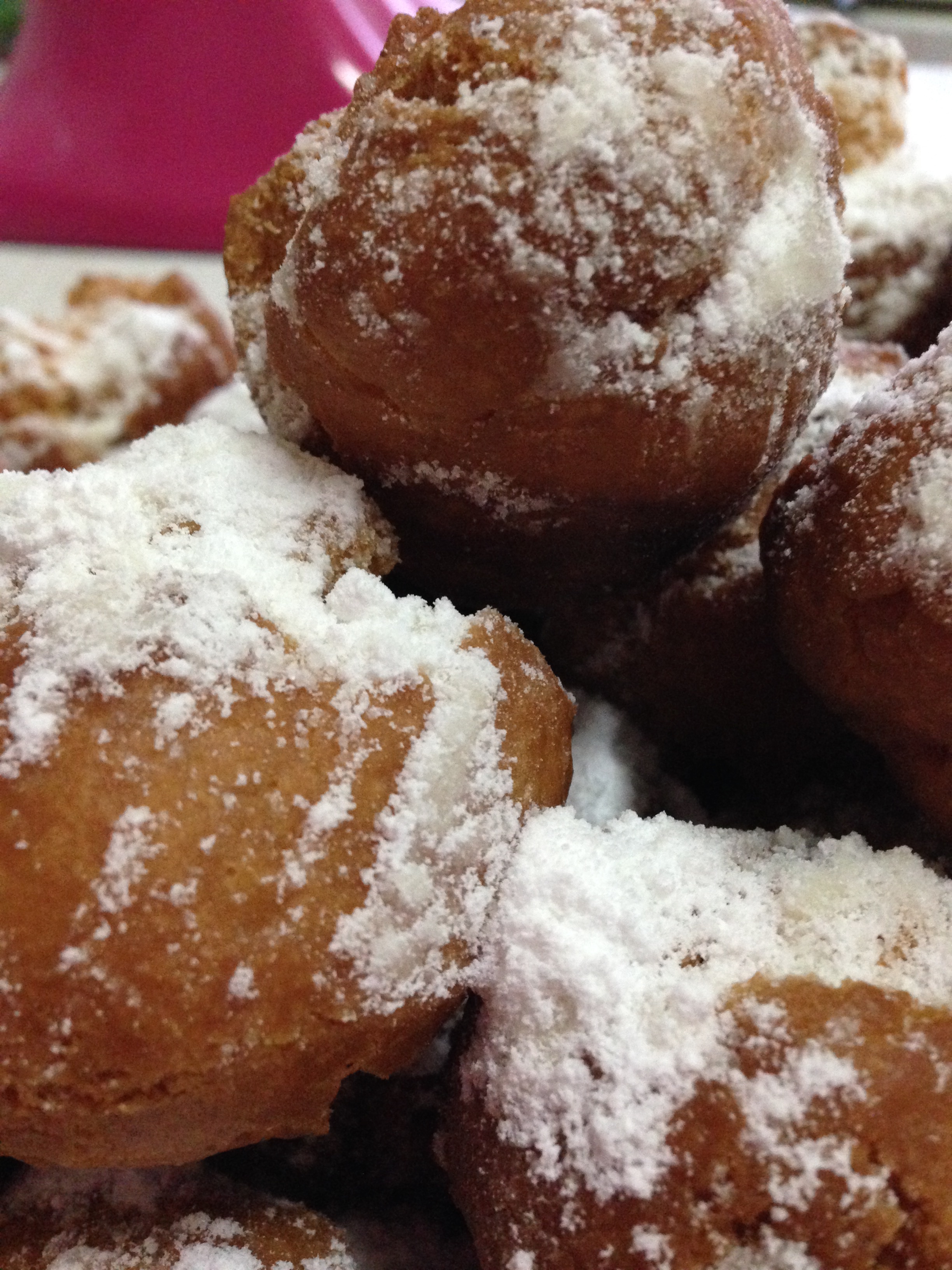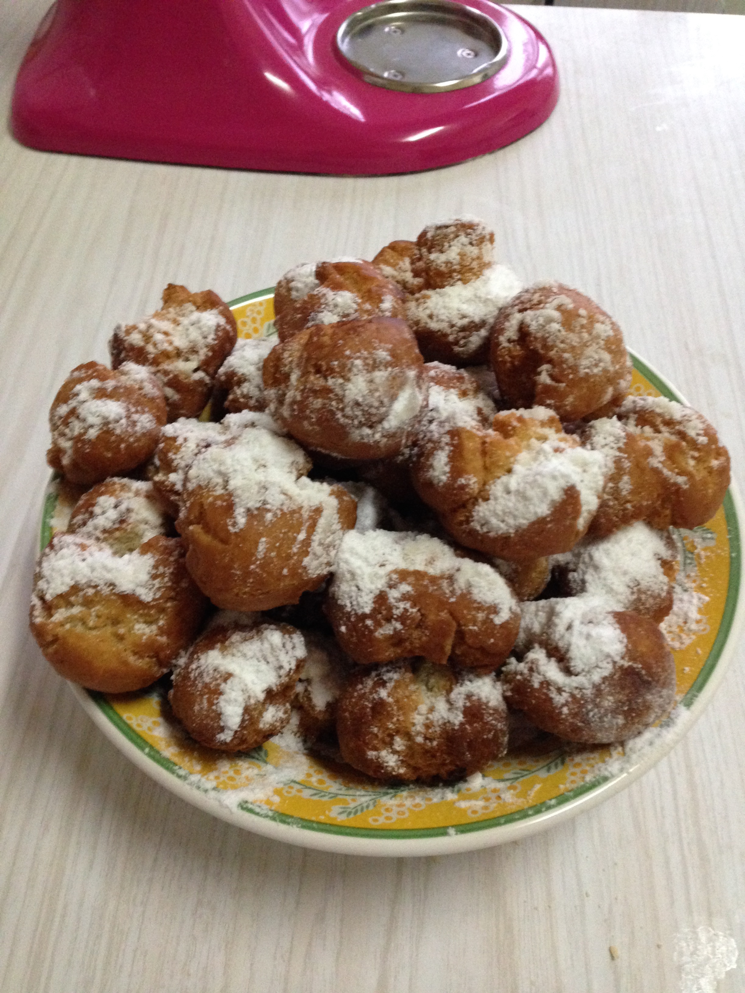 Empezamos batiendo los huevos junto con el yogurt, cuando este bien unido añadimos el azucar y la ralladura del limón, ahora el zumo del mismo y el aceite, añadimos la levadura y por ultimo vamos incorporando la harina hasta crear una pasta que no se pegue a las manos (os va a llevar el kilo de harina), vamos haciendo bolitas del tamaño de una canica (porque crecen mucho), cuando las tengamos todas ponemos un cazo con aceite a calentar y una vez caliente (aceite bastante para que cubra las bolitas) vamos friendo de pocas en pocas las bolitas y cuando este doradas las sacamos, las ponemos en papel absorbente para quitar el excedente de aceite y cuando las tengamos todas fritas las ponemos en una fuente, las espolvoreamos con azucar glass y a disfrutar con un chocolate caliente 😉
