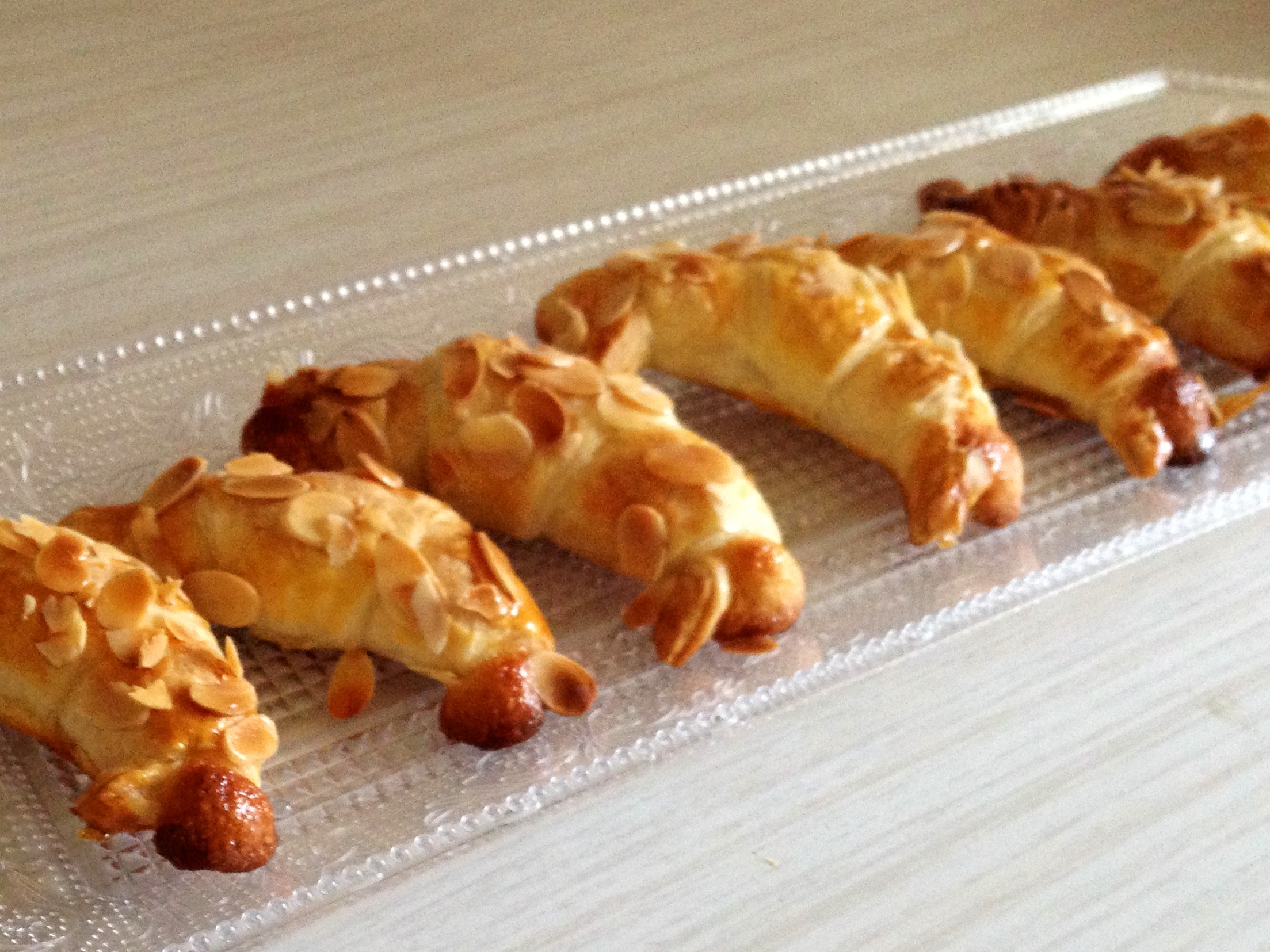Lo primero que preparamos es el rellenos para lo que ponemos en un bol la almendra molida con la vainilla, el azucar, la mantequilla, la maicena y un huevo, cuando tengamos una crema homogénea. Estiramos el hojaldre y lo cortamos en triángulos, el la parte ancha ponemos un poco del relleno y enroscamos sobre si mismo haciendo la forma de cruasán, lo pintamos con el otro huevo batido y rociamos con la almendra en lamina. Cuando este el horno caliente a 180º los introducimos con separación entre ellos y horneamos unos 15 minutos o hasta que este dorados, mientras hacemos el almibar poniendo a hervir el agua con el azucar 10 minutos, cuando ya estén todos hechos los pintamos con el almibar dejamos enfriar y listo!!!