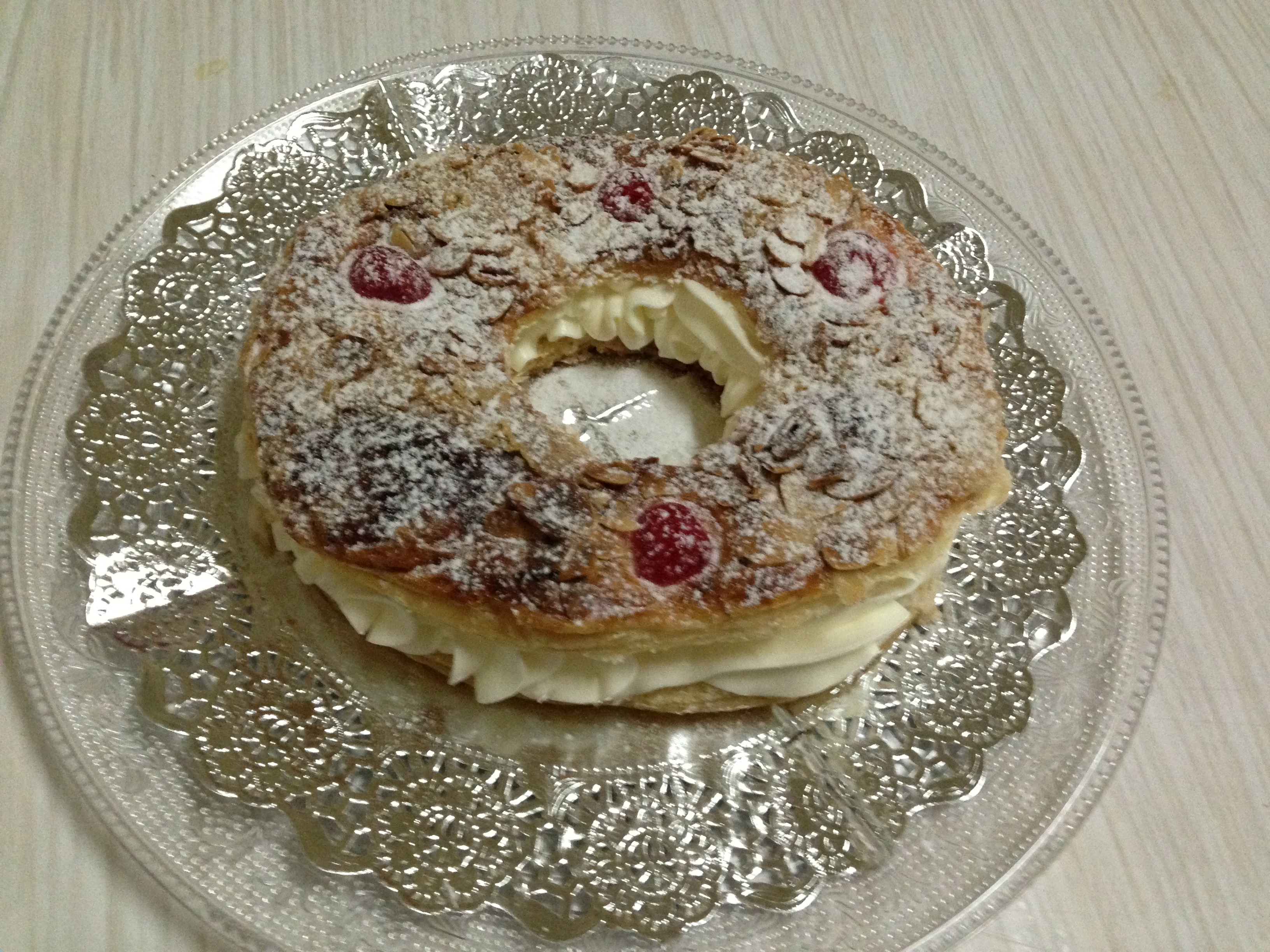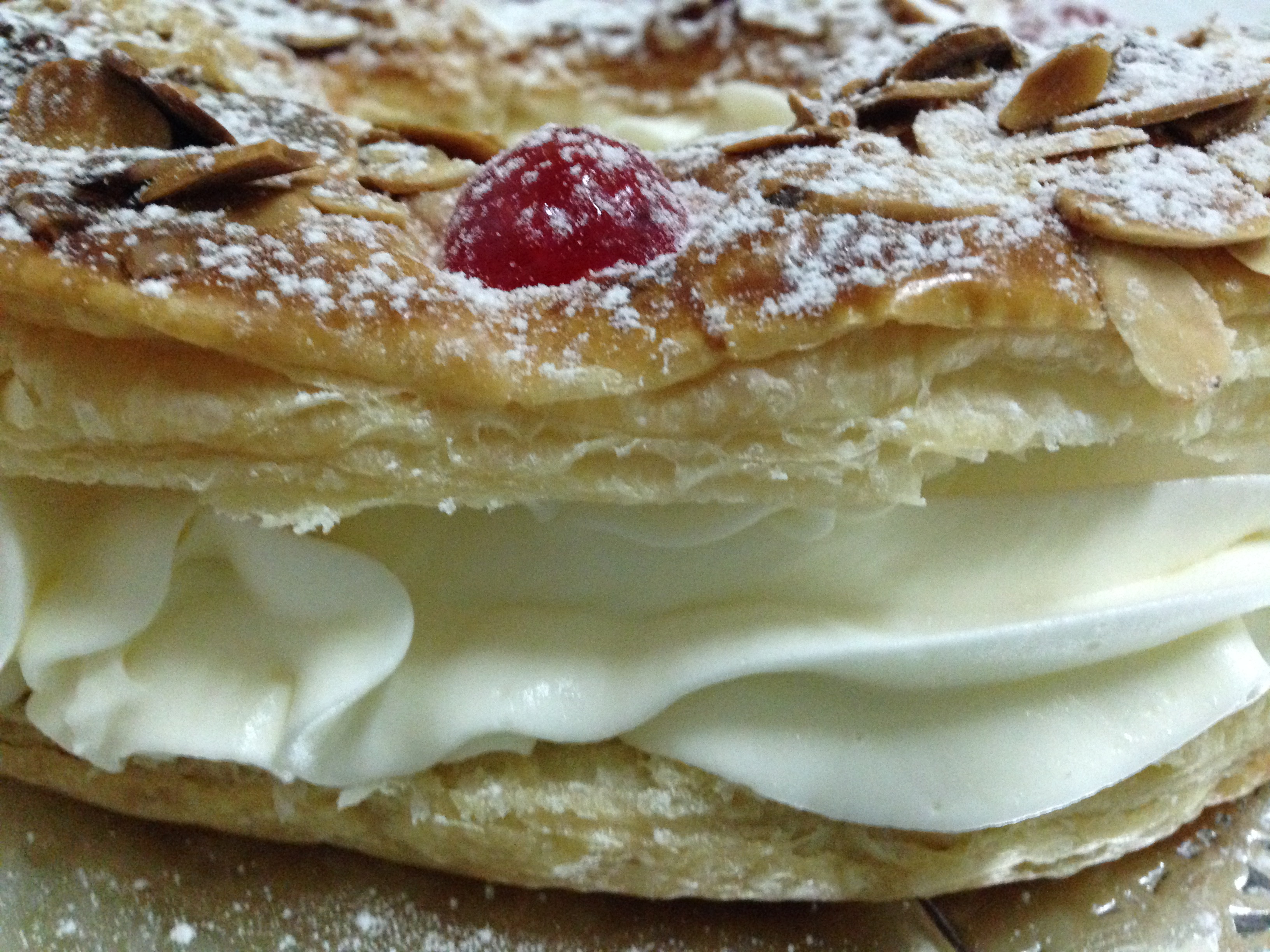 vamos a comenzar horneando el hojaldre así que lo primero que hacemos es con la ayuda de un vaso o un corta pasta redondo recortamos el centro del hojaldre, lo colocamos en la placa del horno cubierto con papel vegetal y mientras calienta a 200ºc barnizamos la superficie, ponemos trozos las cerezas y la almendra laminada, lo llevamos al horno unos 20/25 minutos o hasta que este dorado, lo retiramos del horno y cuando este frío lo abrimos por la mitad, mientras enfriar montamos la nata con el azucar glass hasta que este bien duran, lo pasamos a una manga pastelera para rellenar la rosca, ponemos la tapa, espolvoreamos con azucar glass y a comer!!