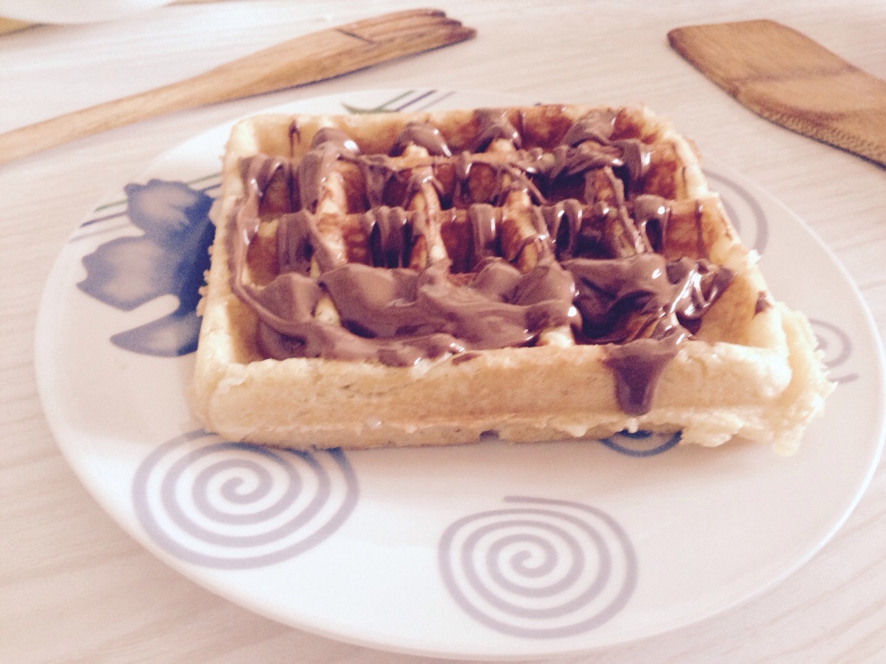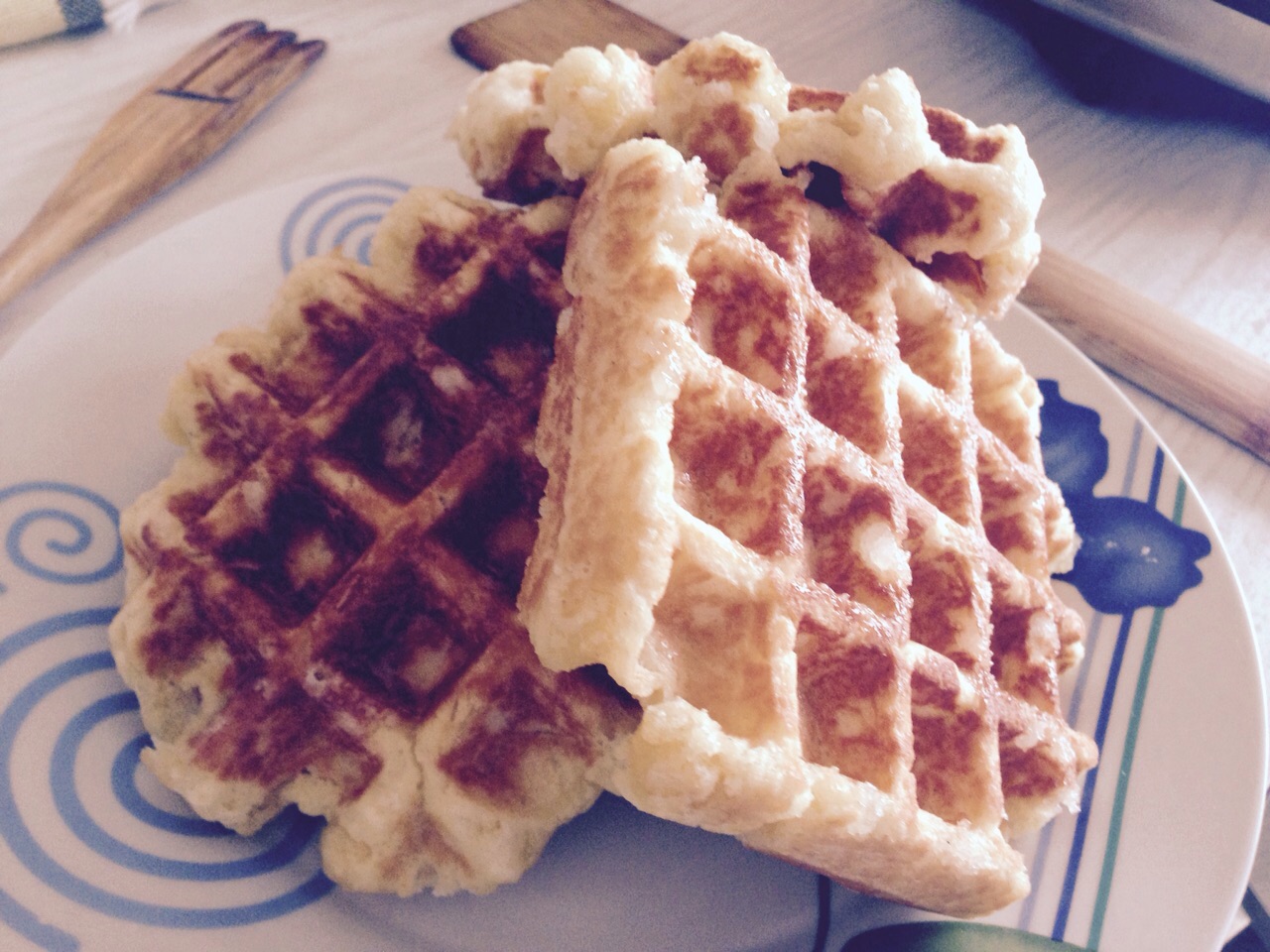Cuando la tengamos vamos cogiendo una cucharada y poniéndola en la gofrera que estará ya caliente y habremos engrasado con un pincel y algo de aceite para evitar que se nos peguen los gofres.
