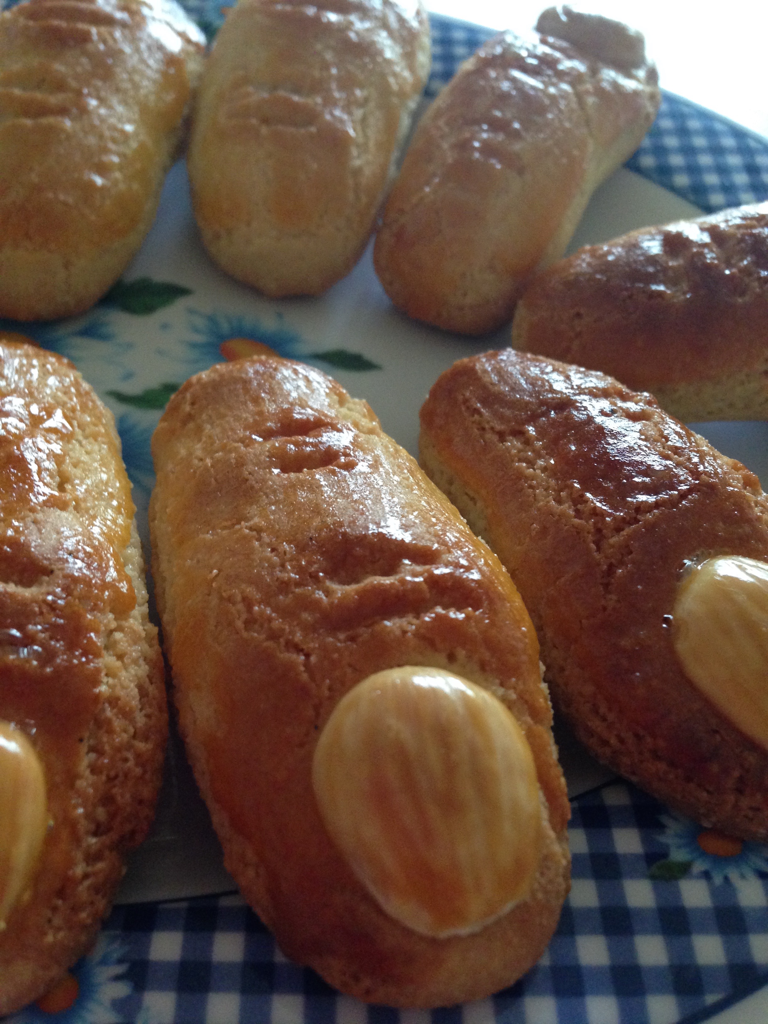 Ponemos en un la almendra, el azucar, la clara del huevo y la vainilla amasamos bien hasta que tengamos una masa compacta y manejable. Ahora vamos cogiendo porciones y les damos la forma de un dedo de la mano, en uno de los bordes colocamos una almendra (apretar bien para que no se despegue cuando las cocinemos), las vamos poniendo en una bandeja de hornear cubierto con papel de horno y con la yema batida los pintamos, una vez este todos pintados les hacemos unas rallitas imitando los pliegues de los dedos y al horno a 180º (que este caliente ya) unos 10 minutos o hasta que los veamos doraditos, los sacamos con cuidado y dejamos enfriar en una rejilla y a comerrrrrrr