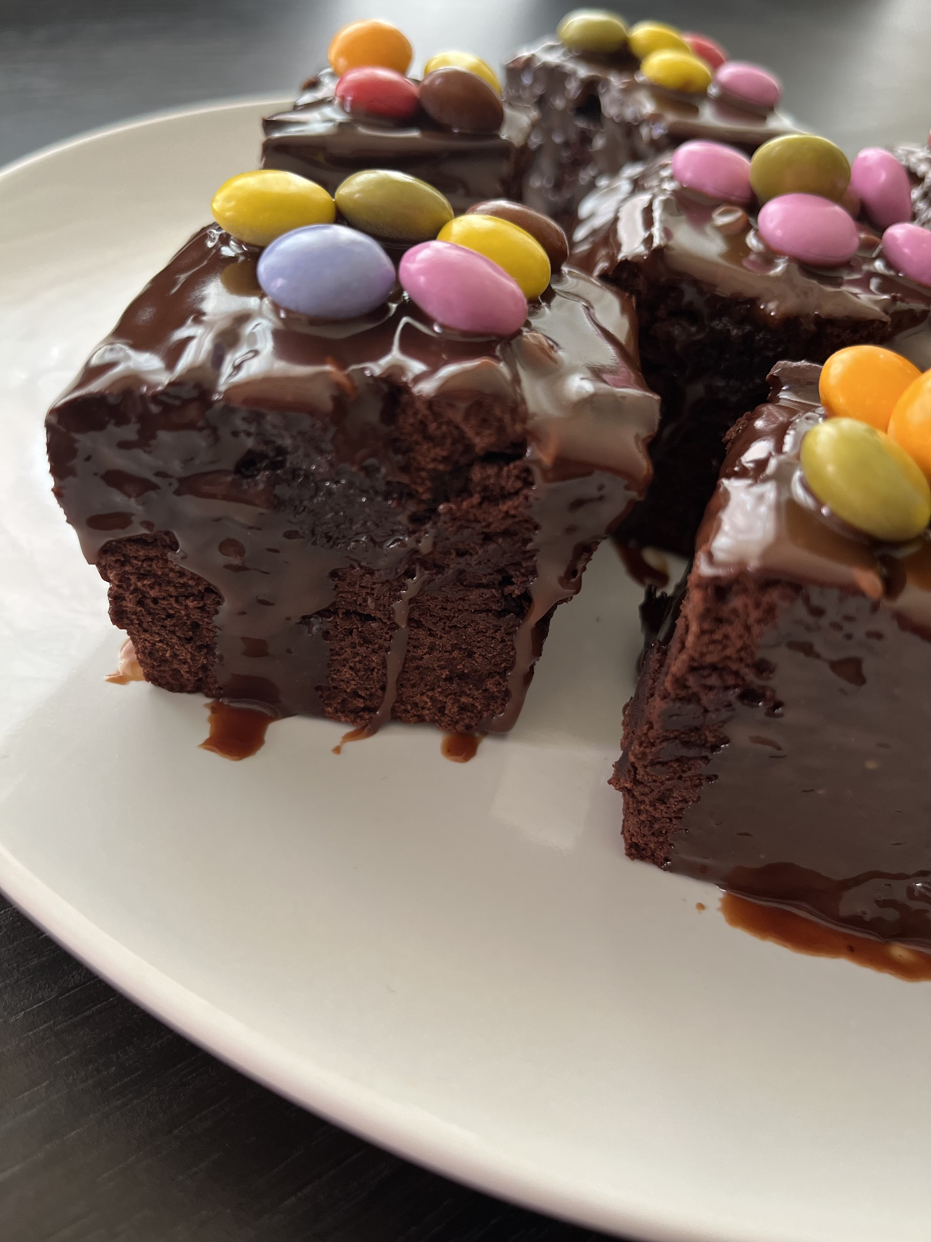 Mientras tenemos el pastel enfriando nos ponemos con la cobertura poniendo todos los ingredientes a fuego medio removiendo sin parar hasta crear una crema sin grumos. Ahora desmoldamos el pastel, pinchamos toda la superficie del pastel y lo cortamos en cuadraditos. Ahora viene la parte farragosa ¡ El baño!!!! ponemos todos los cuadraditos en una rejilla con un molde debajo y vertemos todo el chocolate por encima cubriéndolo bien todo, lo dejamos secar, decoramos al gusto y listo para servir!.