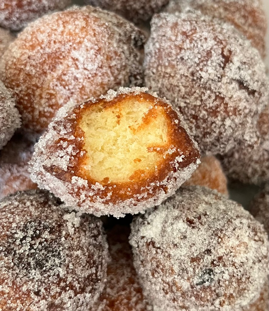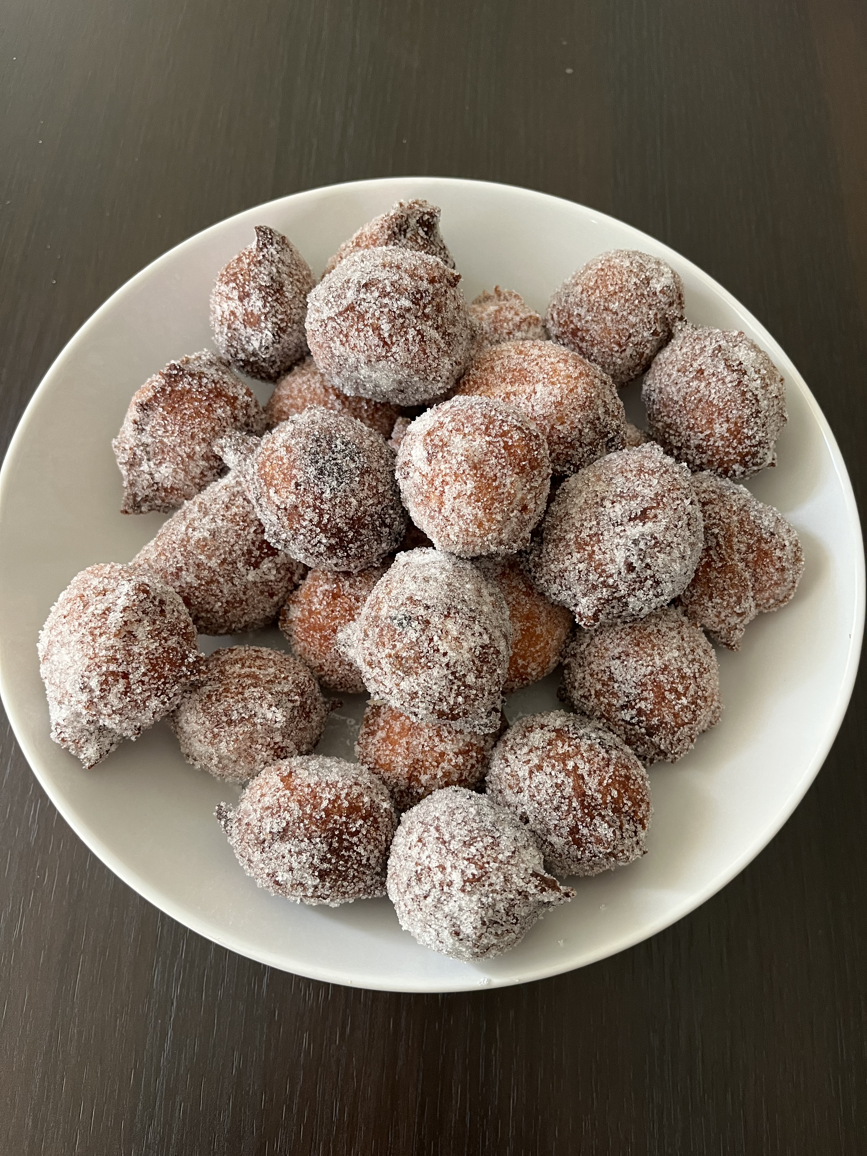 Ya tenemos la masa así que ponemos el aceite a calentar en una sartén o un cazo, una vez lo tengamos con dos cucharitas pequeñas cogemos montoncitos y los vamos friendo, no añadimos muchas porque doblan el tamaño, vamos girándolas cada poco para que no se nos quemen y cuando estén doraditas las pasamos a una bandeja con papel de cocina para que pierdan el sobrante de aceite, a continuación las rebozamos en azúcar antes de que enfríen y así con toda la masa. Salen las que veis en el plato así que no creo que os duren mucho 😉