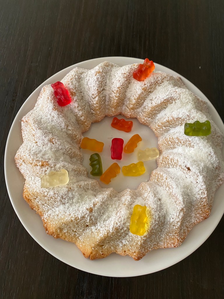 Con todos los ingredientes unidos lo llevamos a un molde de la forma que mas nos guste y con el horno caliente arriba y abajo a 180º unos 40 minutos o hasta que al pinchar el centro salga seco, en ese momento retiramos del horno, dejamos enfriar antes de desmoldar y una vez desmoldado lo decoramos como mas nos guste con azúcar glass, gominolas o como mas os guste.